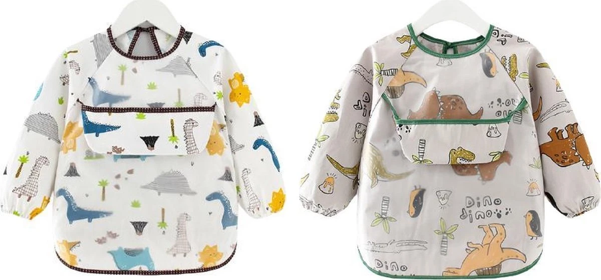 2-pack – Slabbetje Lange Mouwen Met Opvangbak – Groen Dino En Blauw Geel Dino