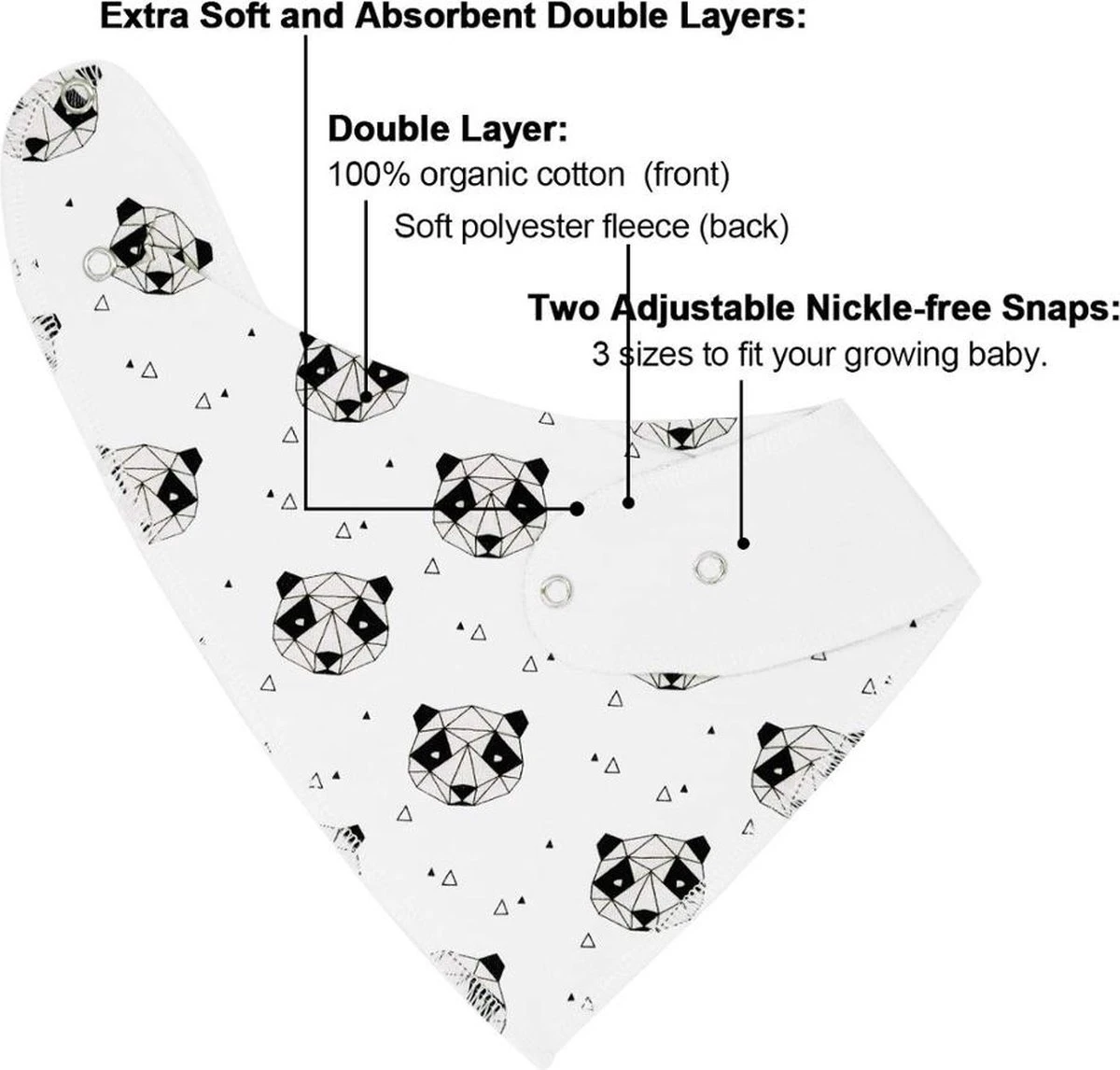 Deze stoere bandana slabbetjes zijn erg handig voor het opvangen van kwijl bij het doorkomen van de tandjes. De slab heeft een extra laag aan de achterzijde dat extra vocht absorbeert. Hierdoor blijft de kleding van jouw MINII droog, wat erg comfortabel is voor je kindje. De slabbetjes zijn gemaakt van 100% katoen en zijn voorzien van mooie stoere prints. Het slabbetje kan in 2 maten vastgezet worden door middel van drukknoppen. Hierdoor zal elk kindje de slabber passen. Deze slabbetjes zijn ook erg leuk om als (kraam)cadeau te geven! Verkrijgbaar in set van 6.