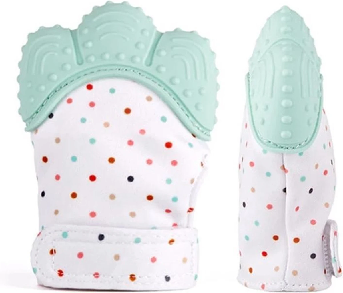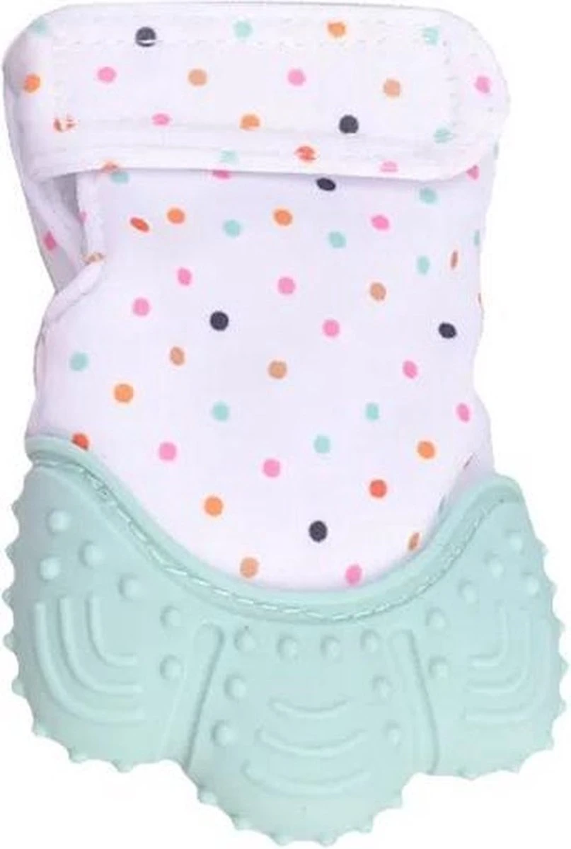 Het zachte silicone aan de bovenkant van de handschoen heeft meerdere bijtzones en verschillende structuren om lekker op te bijten, knabbelen en sabbelen. Dit zorgt voor een verminderde kans op geïrriteerd tandvlees en verlicht de pijn.
