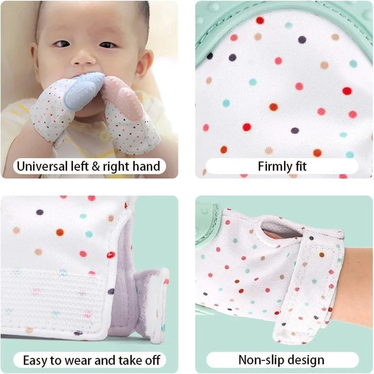 Onze bijthandschoen helpt je baby met het goed en gezond doorkomen van tandjes doormiddel van de verzachtende werking tegen tandpijn. De handschoen zorgt er voor dat de baby zichzelf niet kan krabben, wanneer deze last heeft van de jeuk van de doorkomende tandjes. De handschoen vermindert daarnaast kans op blaren van het duimen en irritatie van de huid door overmatig speeksel.