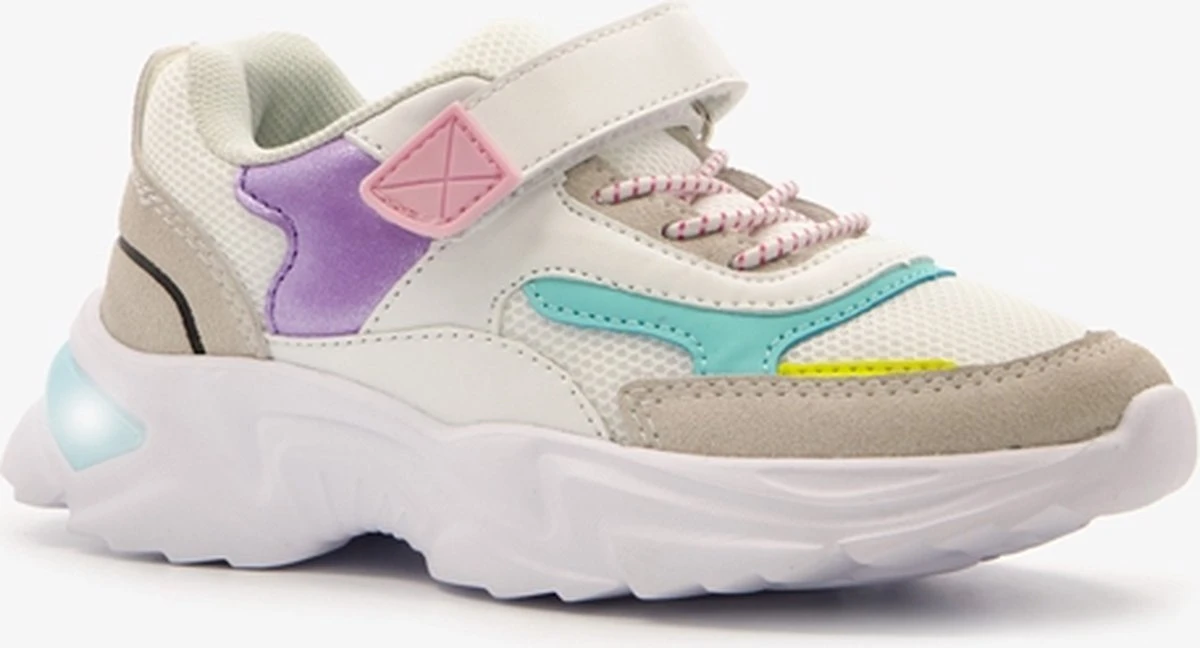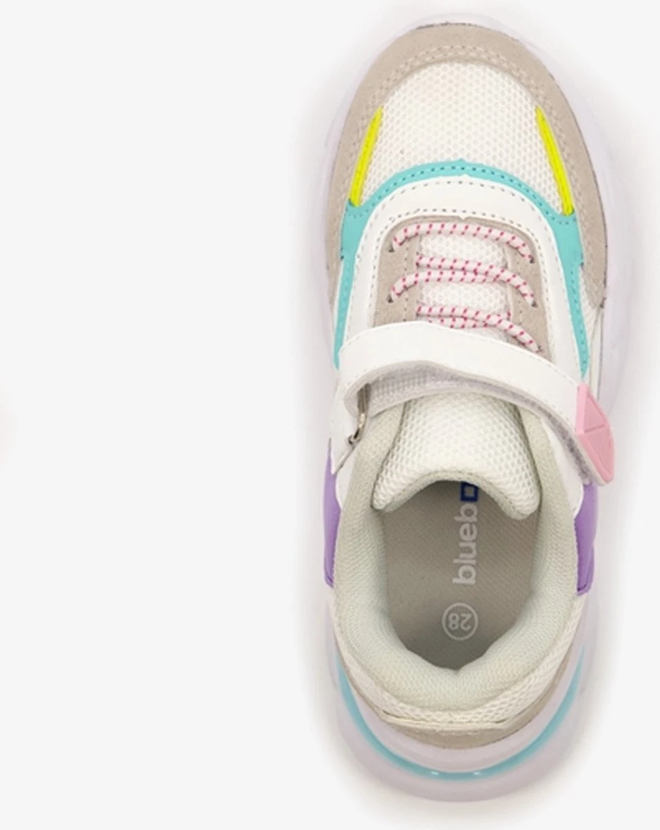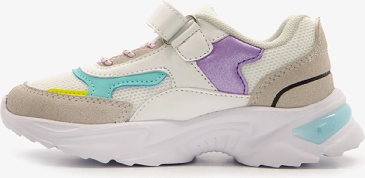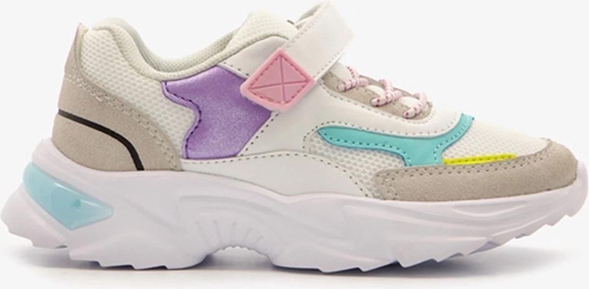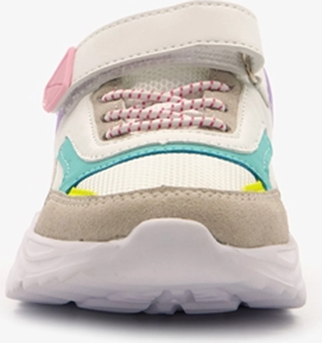 Beige dad sneakers voor meiden. Gemaakt van imitatieleer, een binnenwerk van textiel en een grove zool van rubber. De sneakers hebben elastische veters met klittenbandsluiting voor een makkelijke instap. Het uitneembare voetbed is gemaakt van textiel. De dad sneakers hebben pastelkleurie accenten op het bovenwerk en lichtjes in de zool.