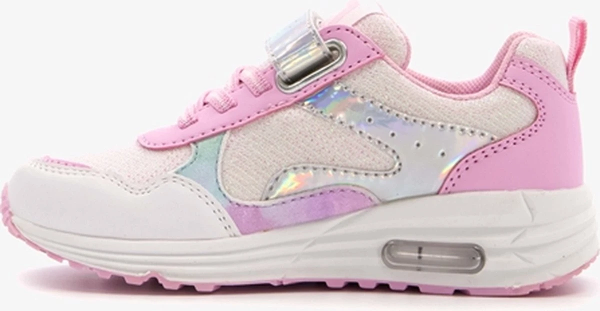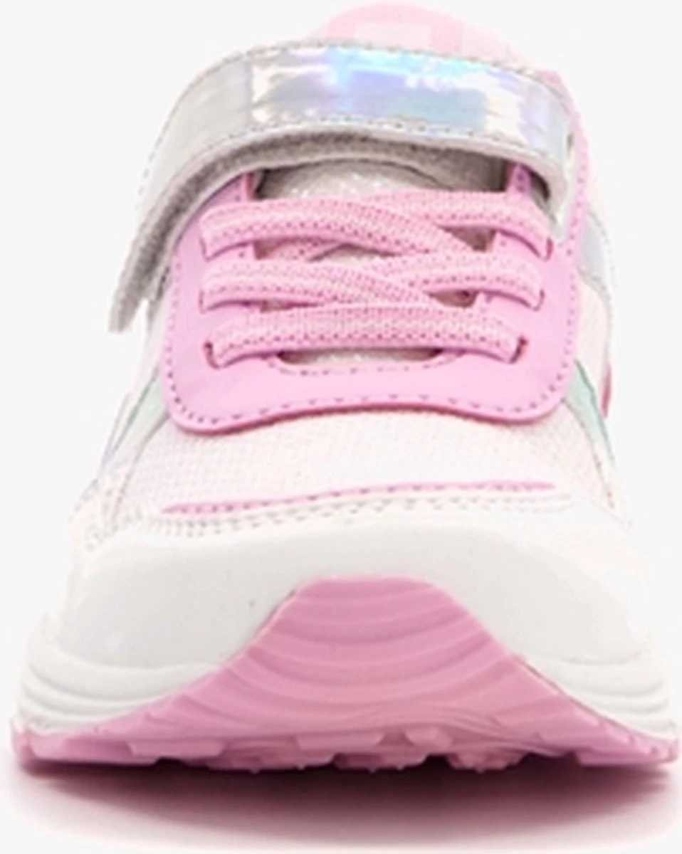 Roze/witte meisjes sneakers Blue Box. Gemaakt van imitatieleer, een binnenwerk van textiel en een stevige roze airzool die grip en demping biedt. De sneakers hebben roze elastische veters en een klittenbandsuiting. Het comfortabele voetbed is gemaakt van textiel. Deze is uitneembaar zodat eigen zooltljes erin gelegd kunnen worden. Het buitenwerk is voorzien van metallic inzetten en mesh inzetten op de neus.