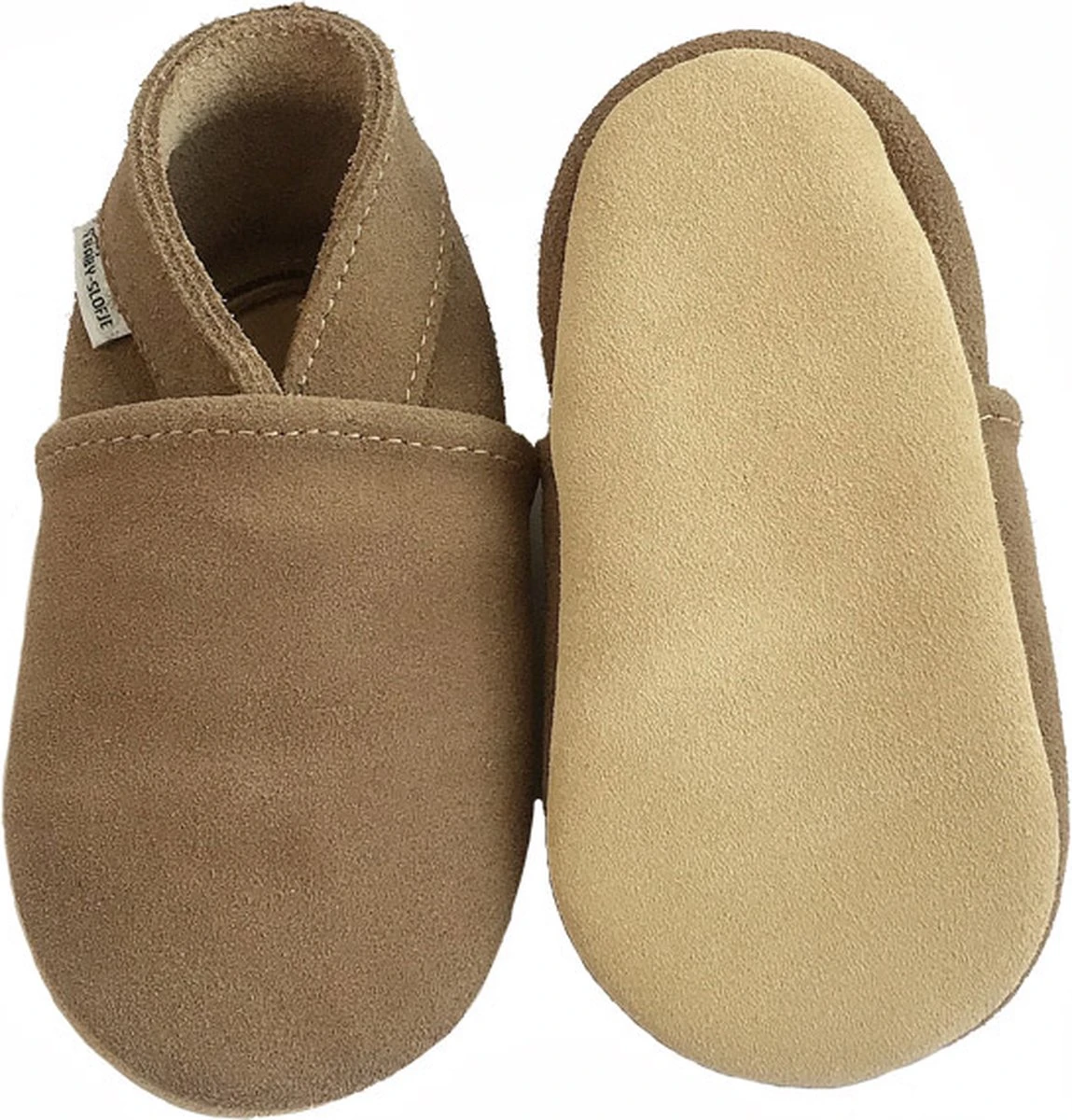 Met suede zool tegen uitglijden en elastiek aan de voorkant om de slofjes gemakkelijk aan te krijgen.