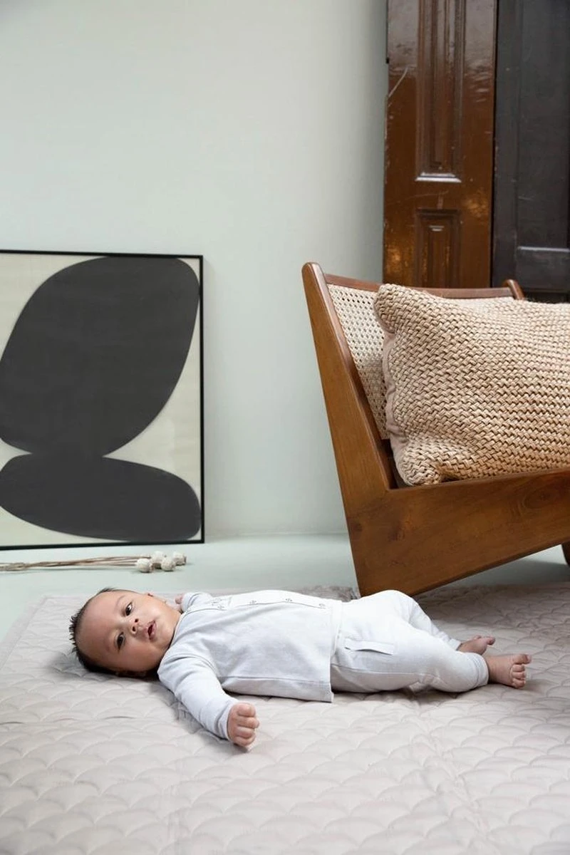3-delig Dirkje unisex babysetje. Dit setje dat zowel door jongens als door meisjes gedragen kan worden is licht grijs van kleur en bevat een all over print van off-white regendruppels. Het shirtje is volledig horizontaal gestreept in de kleuren off-white en licht grijs. De broek bevat twee paspelzakken en omslagboorden. Het vest is voorzien van een borstzakje.