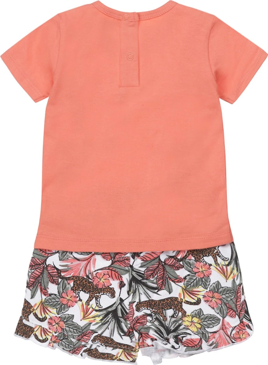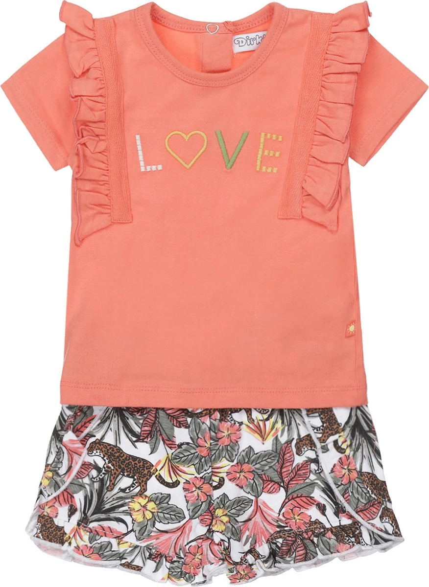 Vrolijk 2-delig setje van Dirkje. Dit setje bestaat uit een t-shirt en een korte joggingbroek. Het shirtje is koraal van kleur en heeft een leuke print en ruches op de voorkant. Het broekje heeft een all over print van planten en tijgers, en leuke ruches!