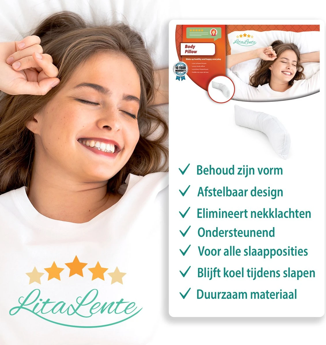 Eindelijk een zorgeloze manier om lekker te slapen! Het Litalente-lichaamskussen is speciaal ontworpen om u van top tot teen comfort en ondersteuning te bieden. Het is het enige kussen dat twee verschillende doelen heeft en kan worden gebruikt als zijslaperkussen, zwangerschapskussen, voedingskussen of slaaprol.