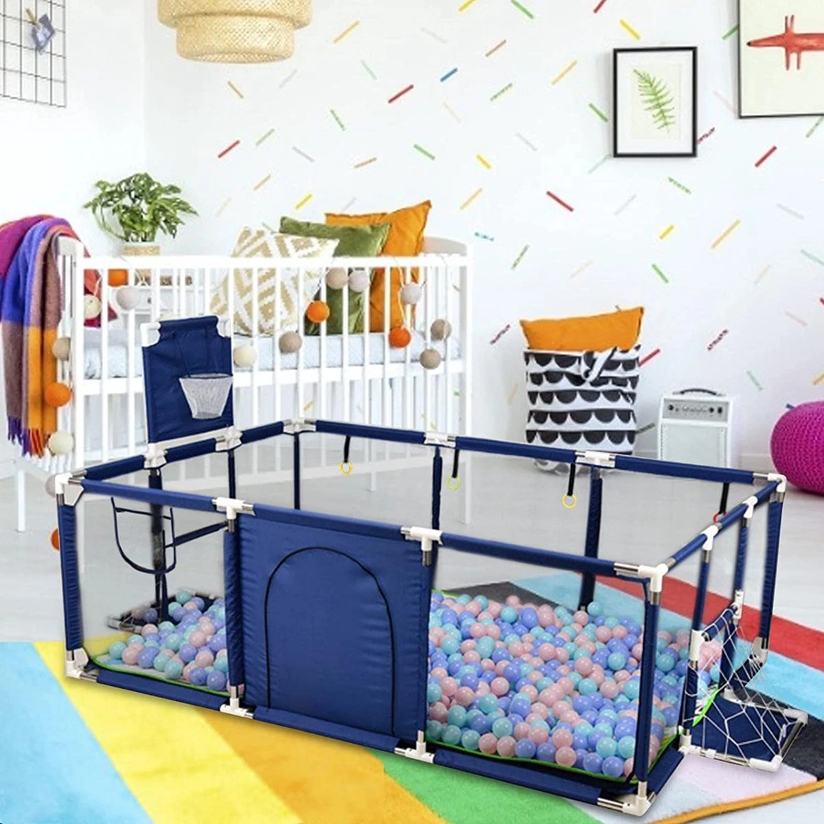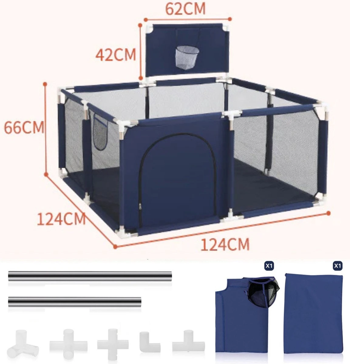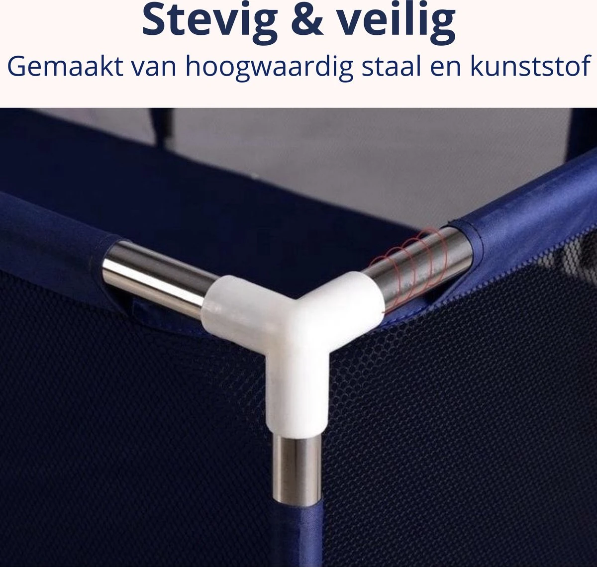 De grondbox is gemaakt van stevige materialen om de veiligheid van de kinderen te garanderen. Het frame is gemaakt van stevig staal en de zijwanden zijn gemaakt van sterk kunststof. De grondbox is ook voorzien van stevige handgrepen en leuningen om te voorkomen dat kinderen eruit vallen. Bovendien is de grondbox voorzien van een ingang met een rits aan de buitenzijde om te voorkomen dat jouw kinderen eruit kruipen.