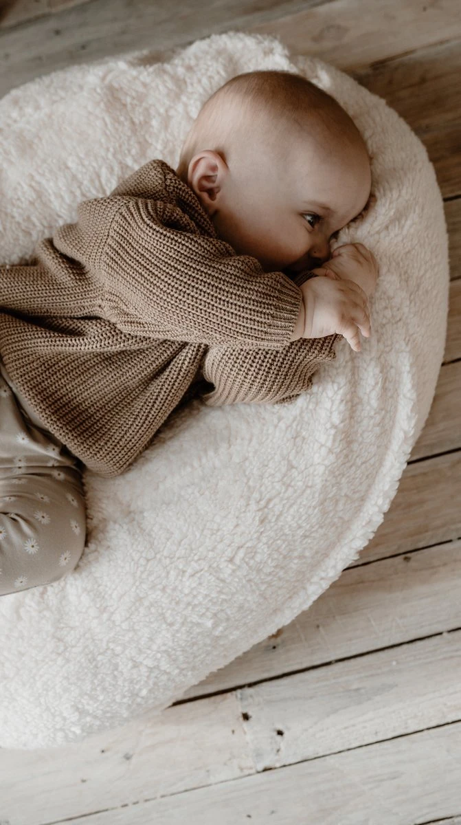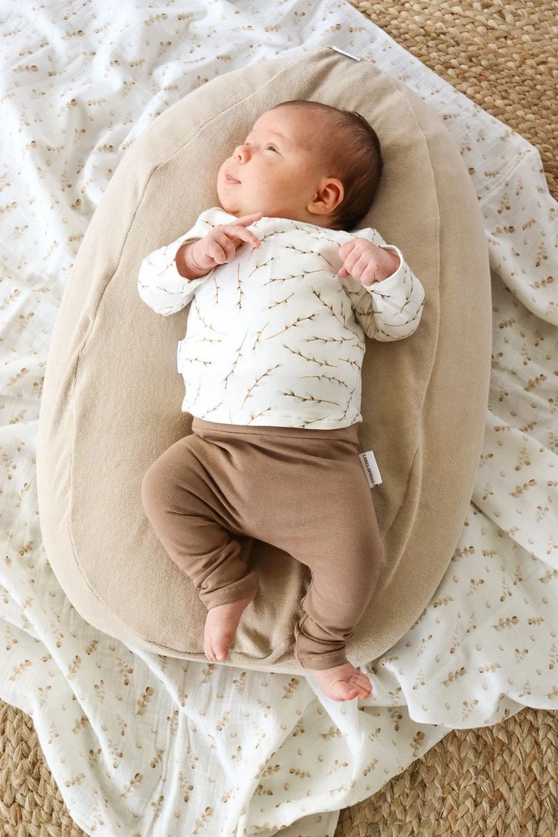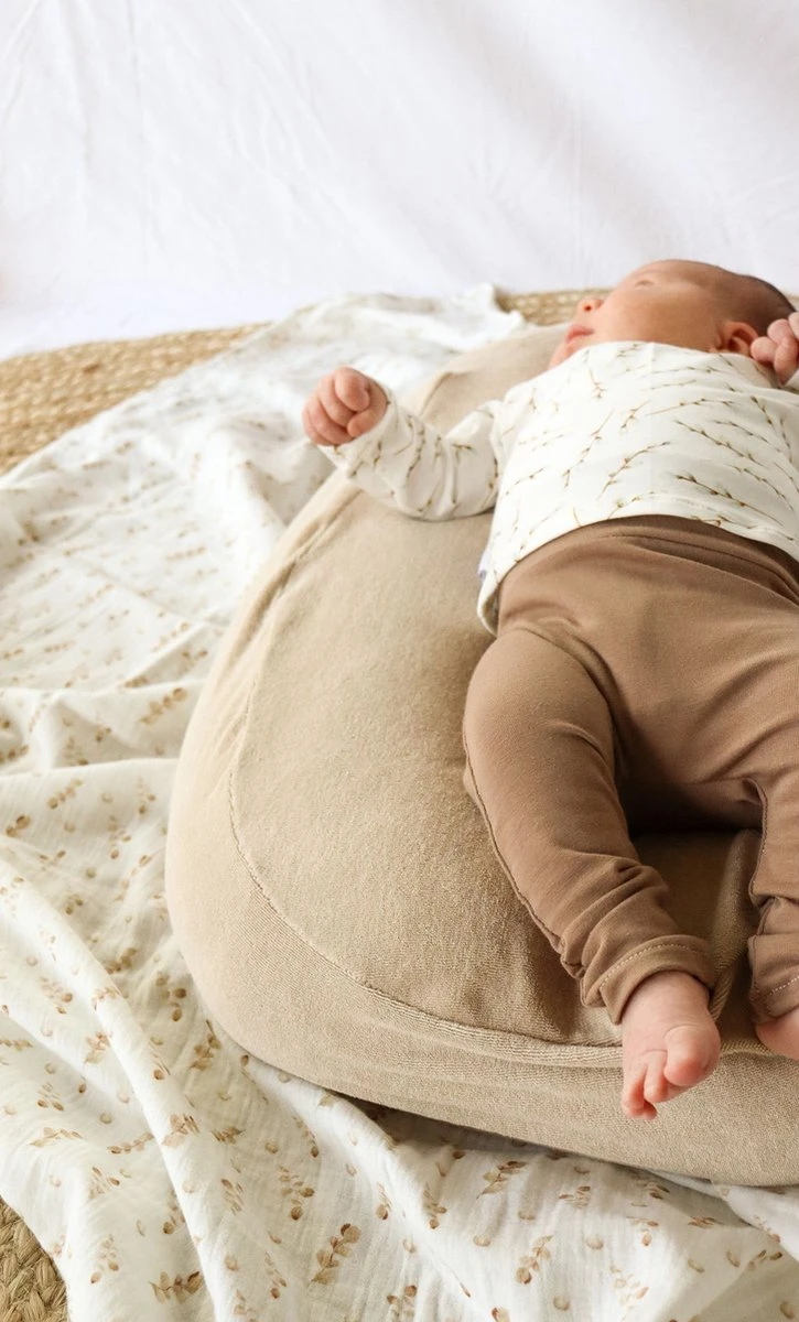 Deze handgemaakte, zachte hoes in zandkleurige badstof kan gebruikt worden om van je voedingskussen een warm en zacht nestje te maken. Ideale stof voor in de zomer. Zo maak je super makkelijk een fijne, geborgen plek voor je kleintje om te loungen, spelen of liggen!