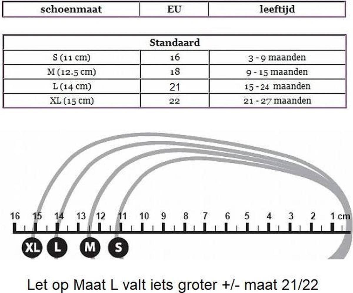 Wat we je graag willen adviseren is om altijd de lengte van de voetjes op te meten. Hou rekening met een halve tot een hele cm aan extra ruimte. Stel dus dat de voetjes 10 cm lang zijn dan zou je een slofje kunnen kiezen met een zoollengte van 10,5 tot 11,0 cm. Op de bijgevoegde foto kun je dan de juiste maat vinden.