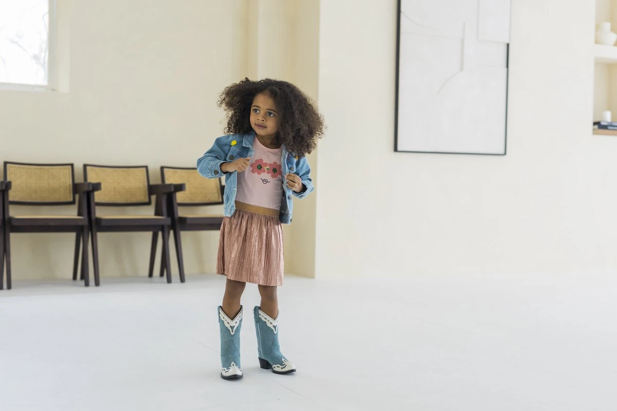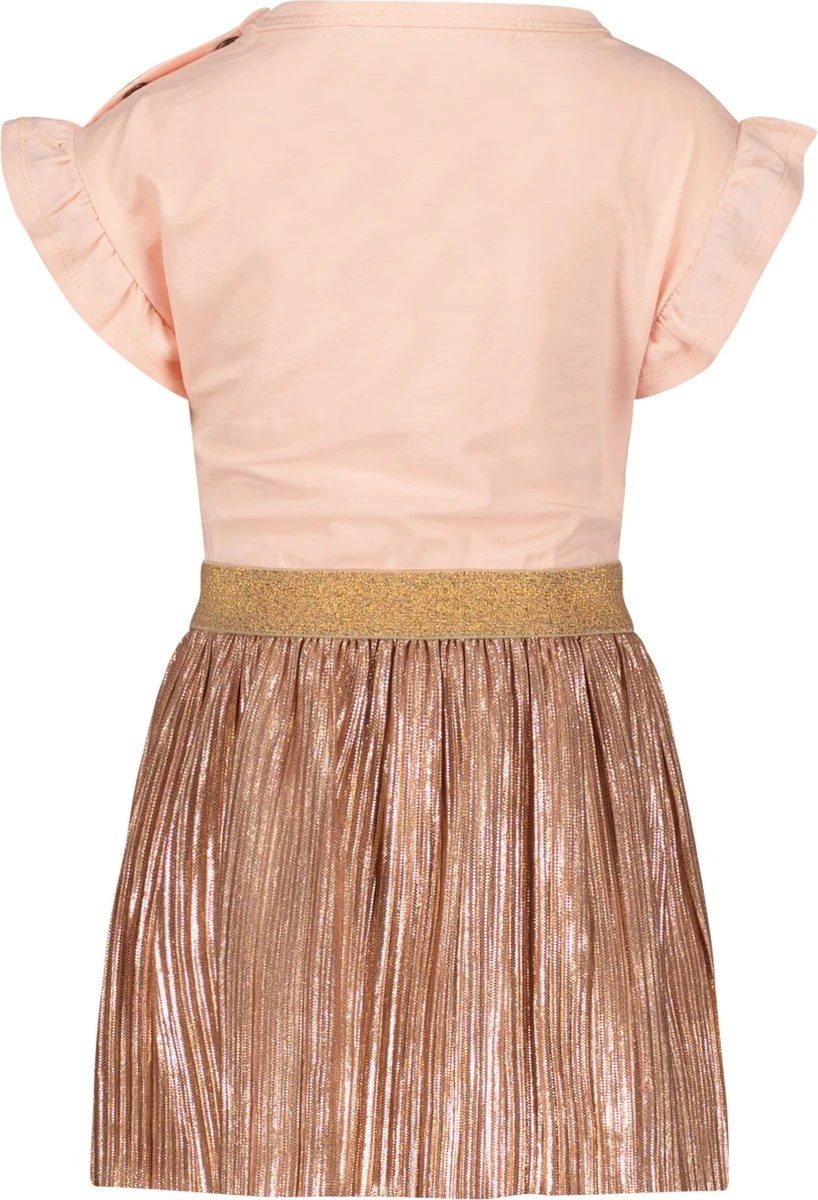 Heerlijk FLO jurkje in prachtige rosé tinten. Het lijfje is gemaakt van de zachtste sorbet slub jersey met luxe flower terry borduur in roze tonen. De mouwen zijn afgewerkt met leuke roeseltjes voor een fancy twist. Het rose gouden metallic plissé rokje geeft het jurkje een mooi silhouette en een stoere look. De rosé gouden taille band, het licht roze lijfje en metallic rosé passen heel mooi samen zonder te zoet te zijn. Style hem af met ons denim jasje en hippe ijsblauwe cowboy boots volgens de laatste trends. Langs de nek zitten handige drukkers om hem makkelijk aan te doen.