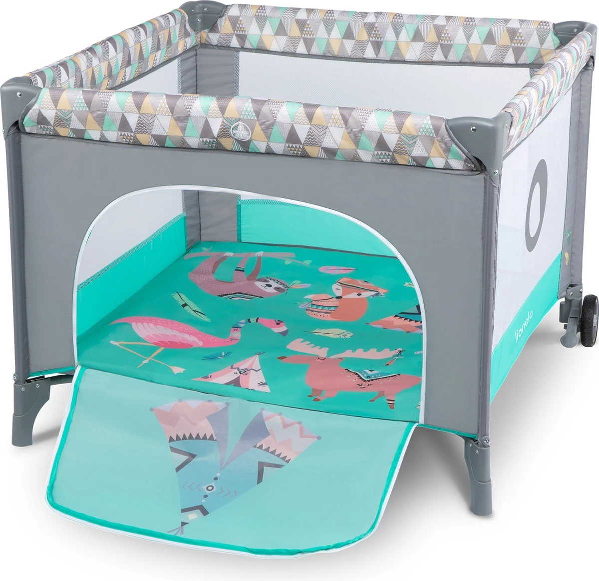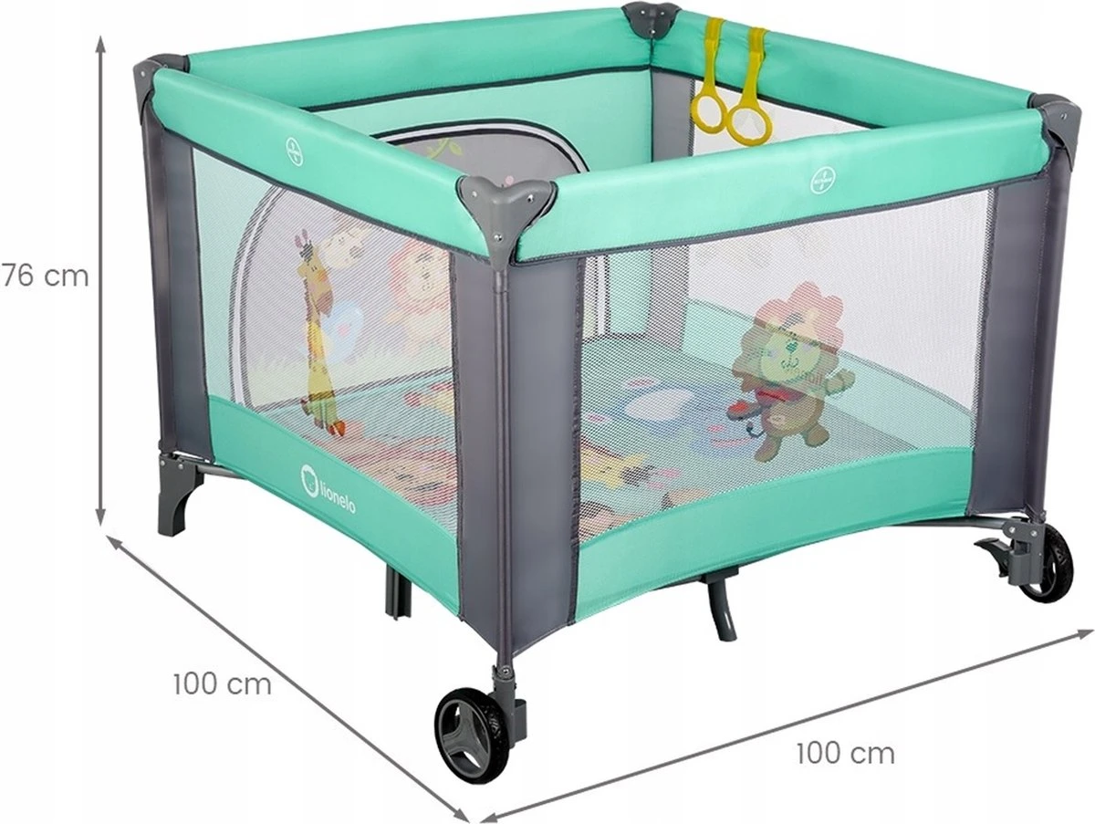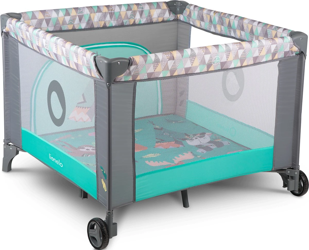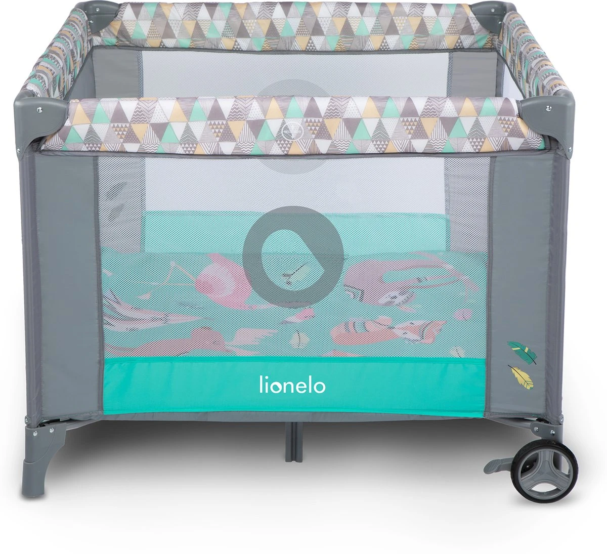 Een speciaal ontworpen kleurrijke print op de matras van Lionelo heeft een positief effect op de ontwikkeling van de fantasie van het kind en stimuleert het spelen in de box.