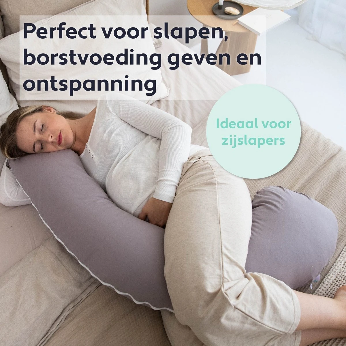 Tijdens de zwangerschap verandert er fysiek en emotioneel veel in het lichaam, hierdoor is er behoefte aan rust en steun, het lichaam veranderdt en hoe verder de maanden vorderen wordt het lichaam steeds meer belast. Belangrijk is dan om van een optimale nachtrust te kunnen genieten. Door de J vorm van dit kussen wordt één zijde van het lichaam volledig van steun voorzien, klachten als benauwdheid en maagzuur worden hierdoor geremd. Niet alleen voor de zwangere geeft het kussen de ideale ondersteuning, door de vormgeving van het kussen wordt ook de baby gestimuleerd om een prettige houding in de baarmoeder aan te nemen.