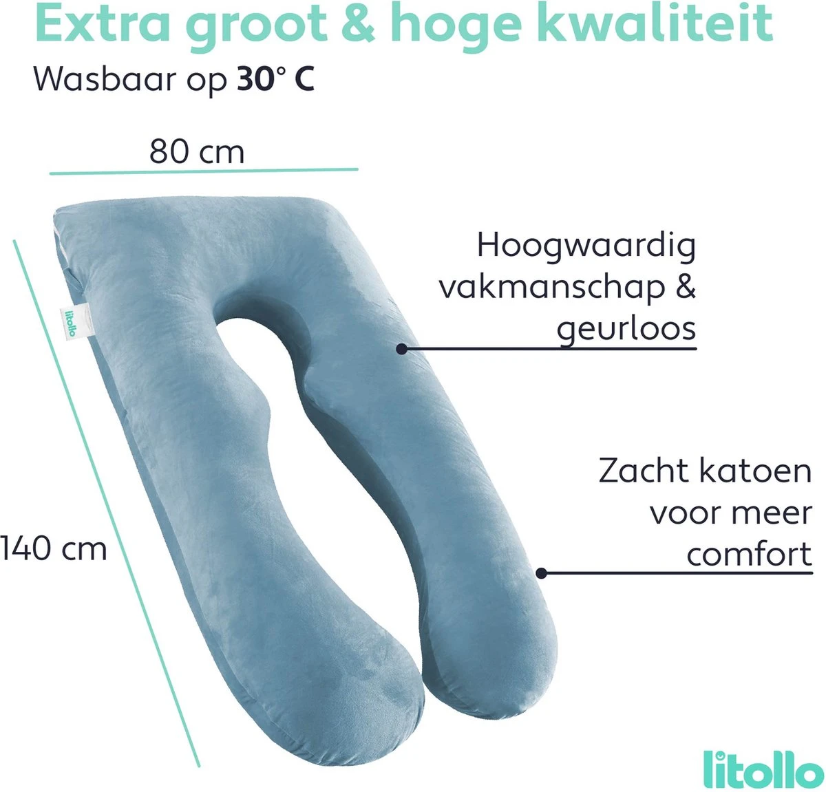 Tijdens de zwangerschap verandert er fysiek en emotioneel veel in het lichaam, hierdoor is er behoefte aan rust en steun, het lichaam veranderd en hoe verder de maanden vorderen wordt het lichaam steeds meer belast. Belangrijk is dan om van een optimale nachtrust te kunnen genieten. Door de vorm van het Litollo XXL kussen wordt er niet alleen steun geboden ook worden veel voorkomende klachten zoals bijvoorbeeld benauwdheid en maagzuur verminderd. Niet alleen voor de zwangere geeft het kussen de ideale ondersteuning, door de vormgeving van het kussen wordt ook de baby gestimuleerd om een prettige houding in de baarmoeder aan te nemen.