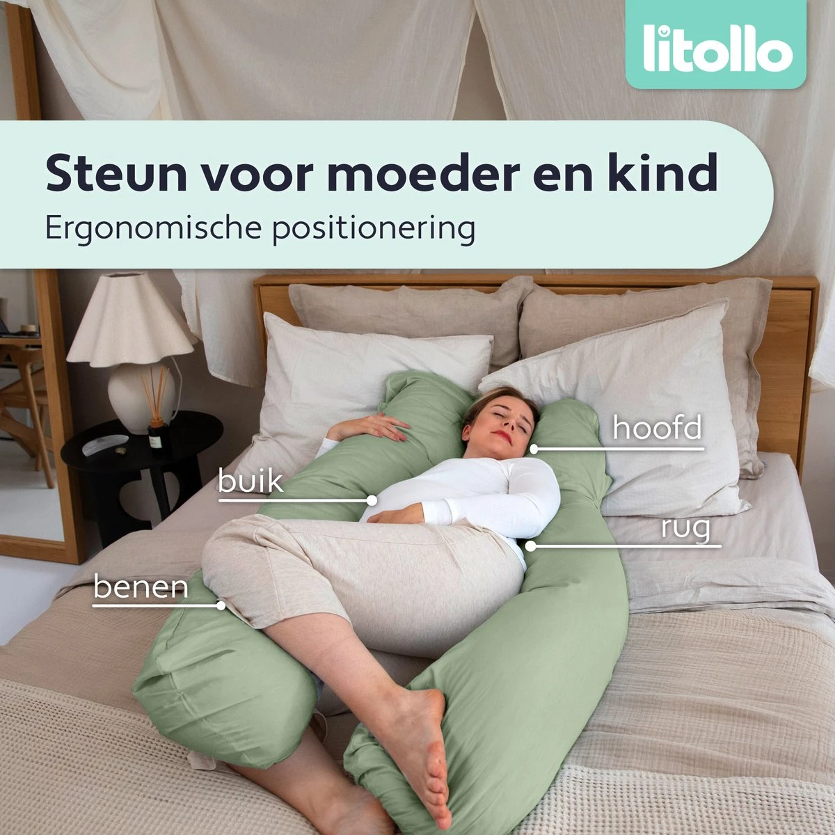 Tijdens de zwangerschap verandert er fysiek en emotioneel veel in het lichaam, hierdoor is er behoefte aan rust en steun, het lichaam veranderd en hoe verder de maanden vorderen wordt het lichaam steeds meer belast. Belangrijk is dan om van een optimale nachtrust te kunnen genieten. Door de vorm van het Litollo XXL kussen wordt er niet alleen steun geboden ook worden veel voorkomende klachten zoals bijvoorbeeld benauwdheid en maagzuur verminderd. Niet alleen voor de zwangere geeft het kussen de ideale ondersteuning, door de vormgeving van het kussen wordt ook de baby gestimuleerd om een prettige houding in de baarmoeder aan te nemen.