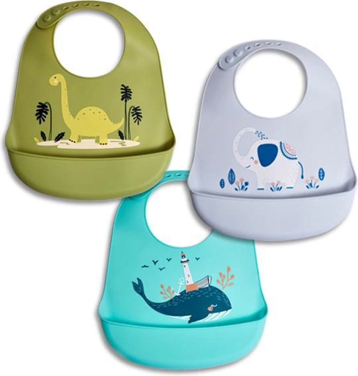 Hippe siliconen slabbers met walvis, zwaan en olifant afbeelding voor de allerkleinsten. Deze slabber is voorzien van een handig opvangbakje voor de restjes eten die geknoeid worden tijdens het eten. De slabber is verstelbaar waardoor deze slabber geschikt is voor kinderen vanaf o tot 4 jaar en lekker lang mee kan.