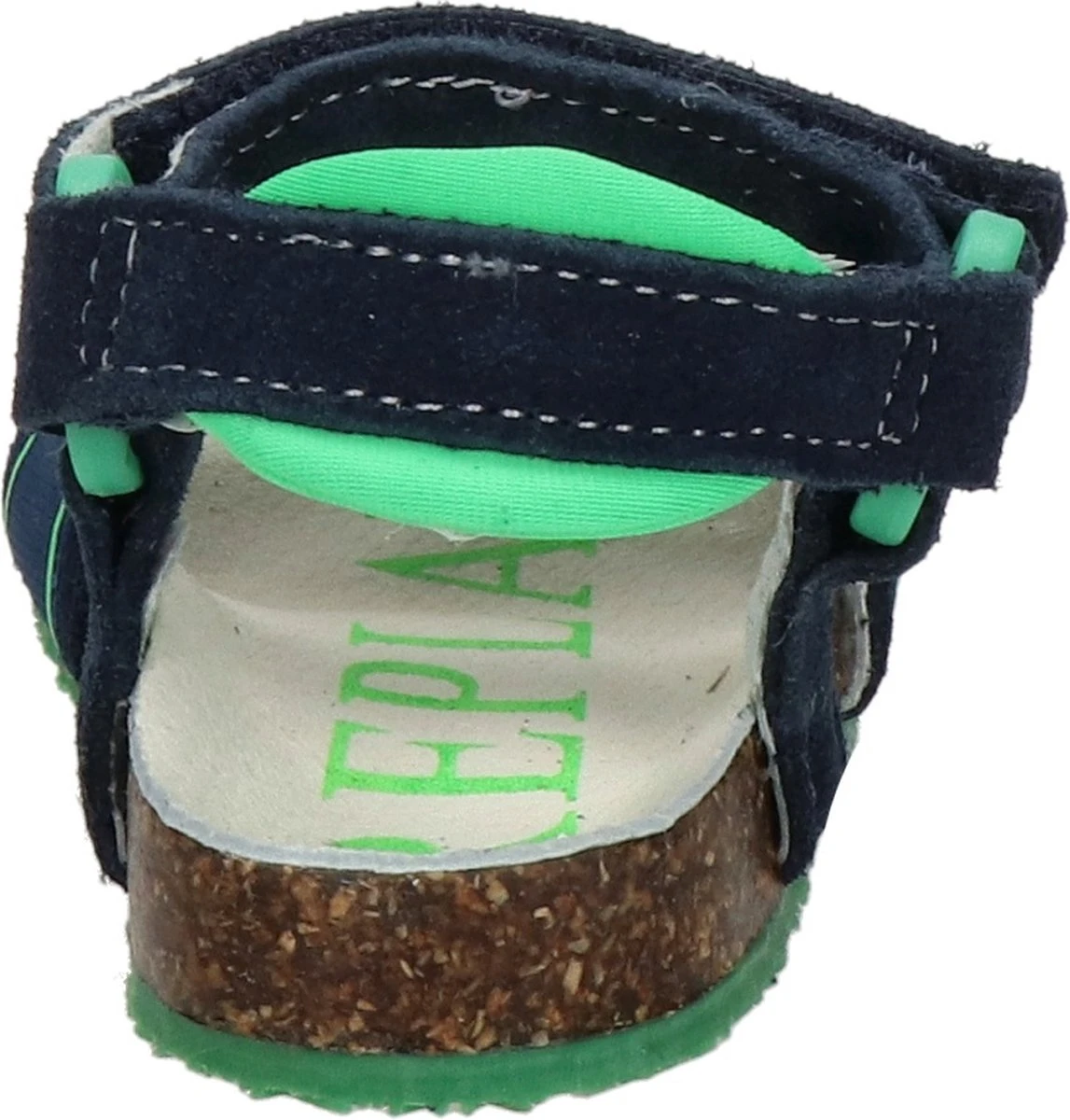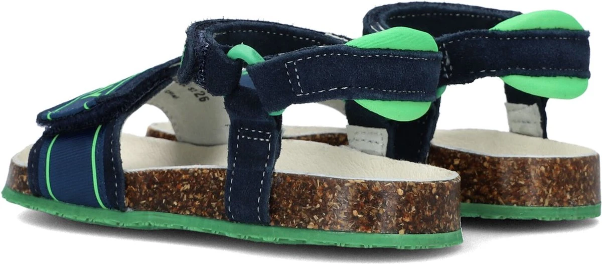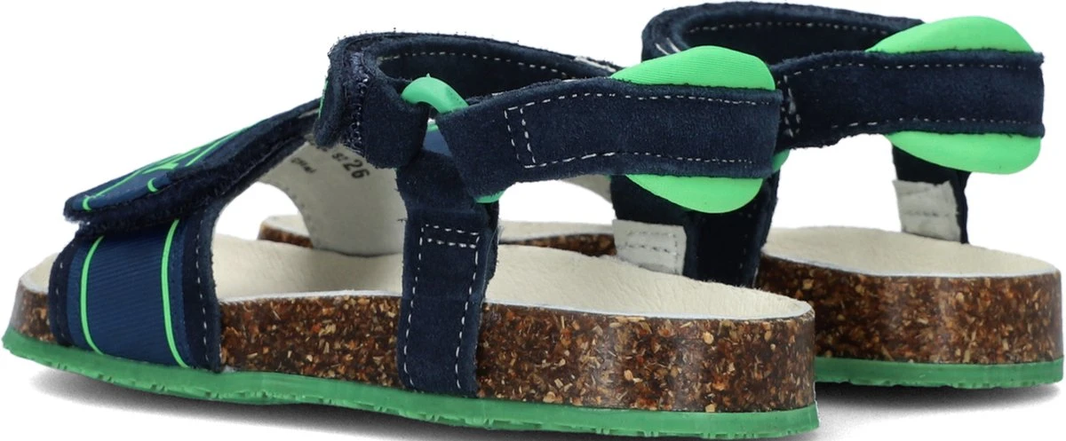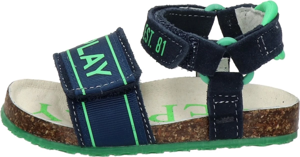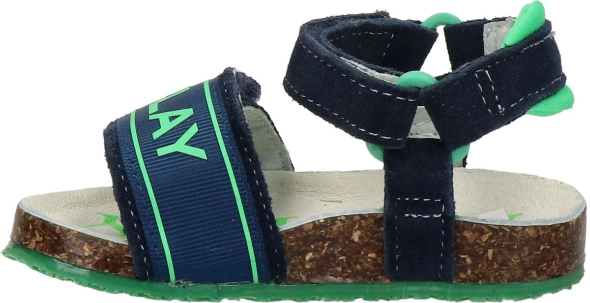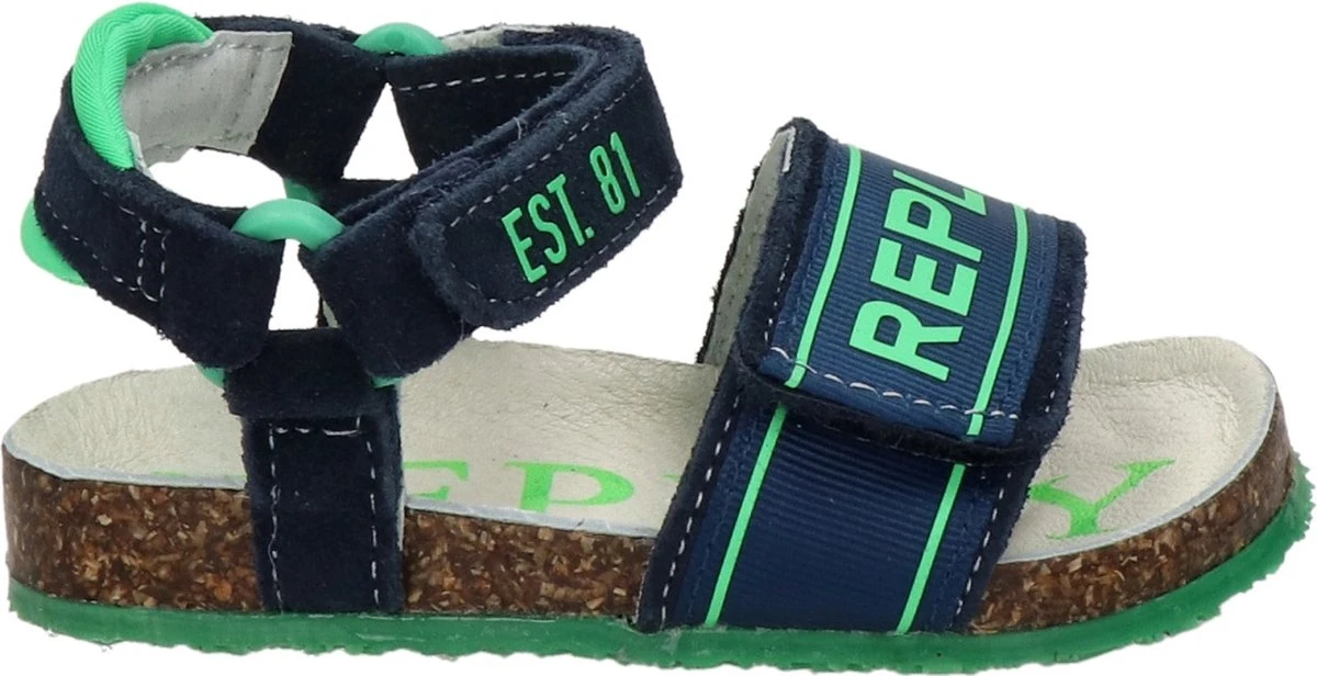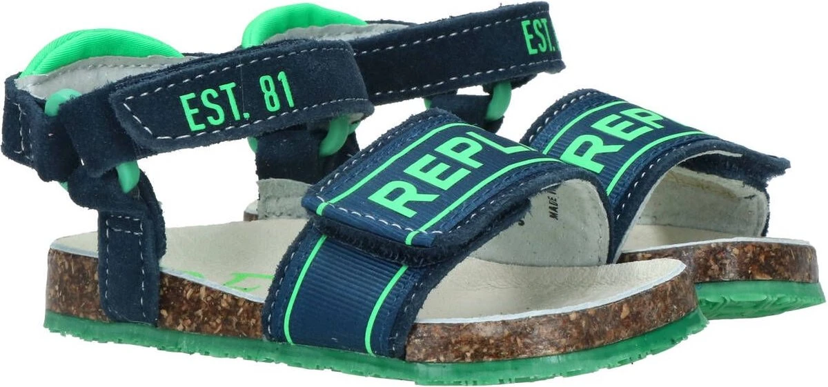 Deze stoere blauwe sandalen met groene accenten Birky JR BOY komen uit de collectie van het merk Replay. De banden zijn uitgevoerd in blauw suède met groene merkopdrukken op de voorvoet en wReef. Het zachte neopreen hielkussentje in combinatie met de leren voering en het fijne voetbed zorgen voor veel comfort. De zool heeft een kurken tussenzool wat zorgt voor veel demping en een rubberen loopzool met gripvast profiel. Door middel van de klittenbandsluitingen trek je ‘m gemakkelijk aan en uit en pas je de sandaal perfect aan naar de voet.