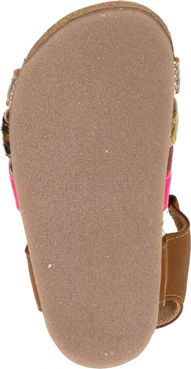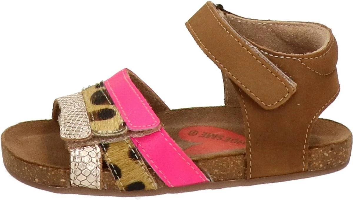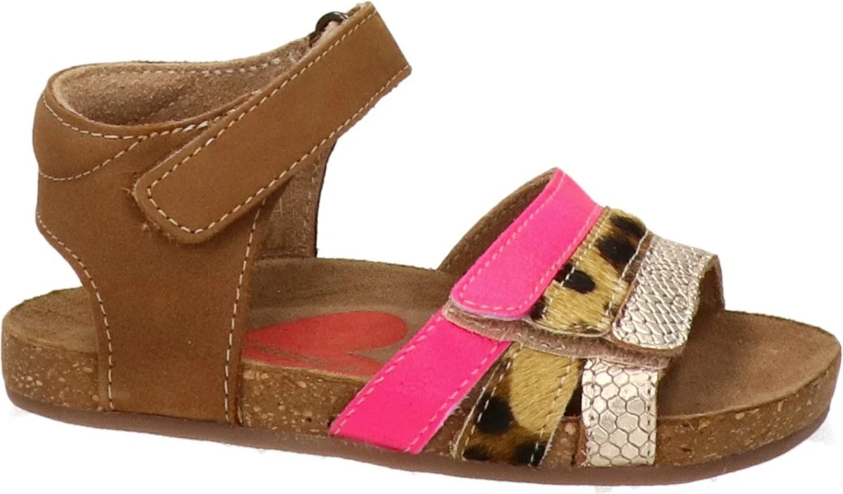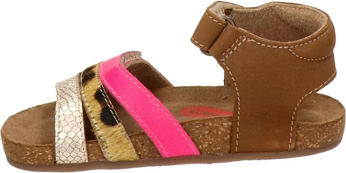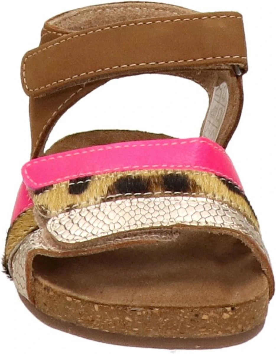 Super leuke sandaal voor de meiden. Gemaakt van cognac leer, met fuchsia en snake-bandjes op de voorvoet. De sandalen gaan gemakkelijk aan en uit door de twee klittenbandsluitingen. Het lichtgewicht voetbed is van kurk en daardoor kunnen kids er lekker op