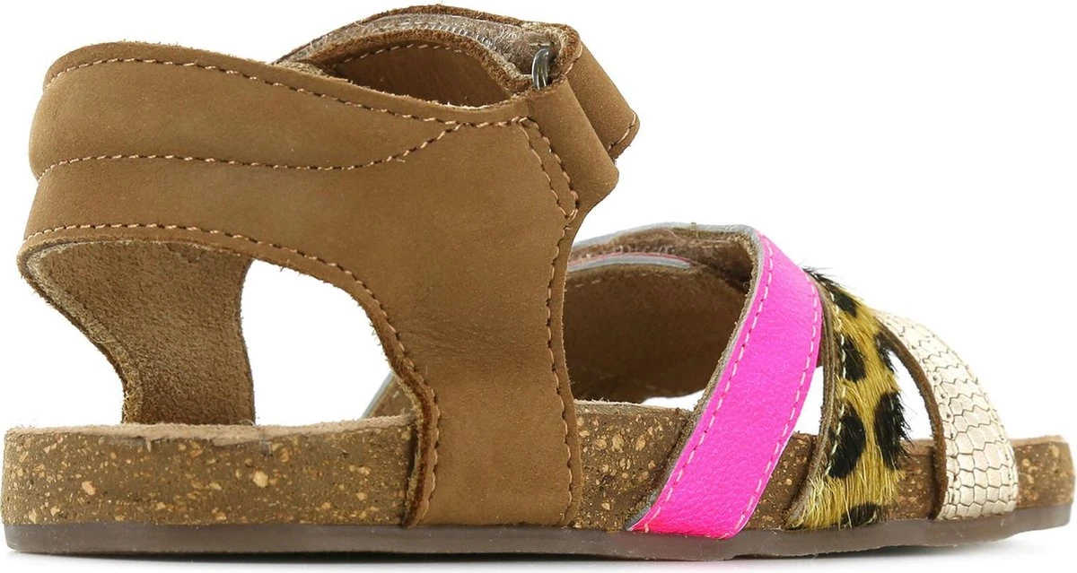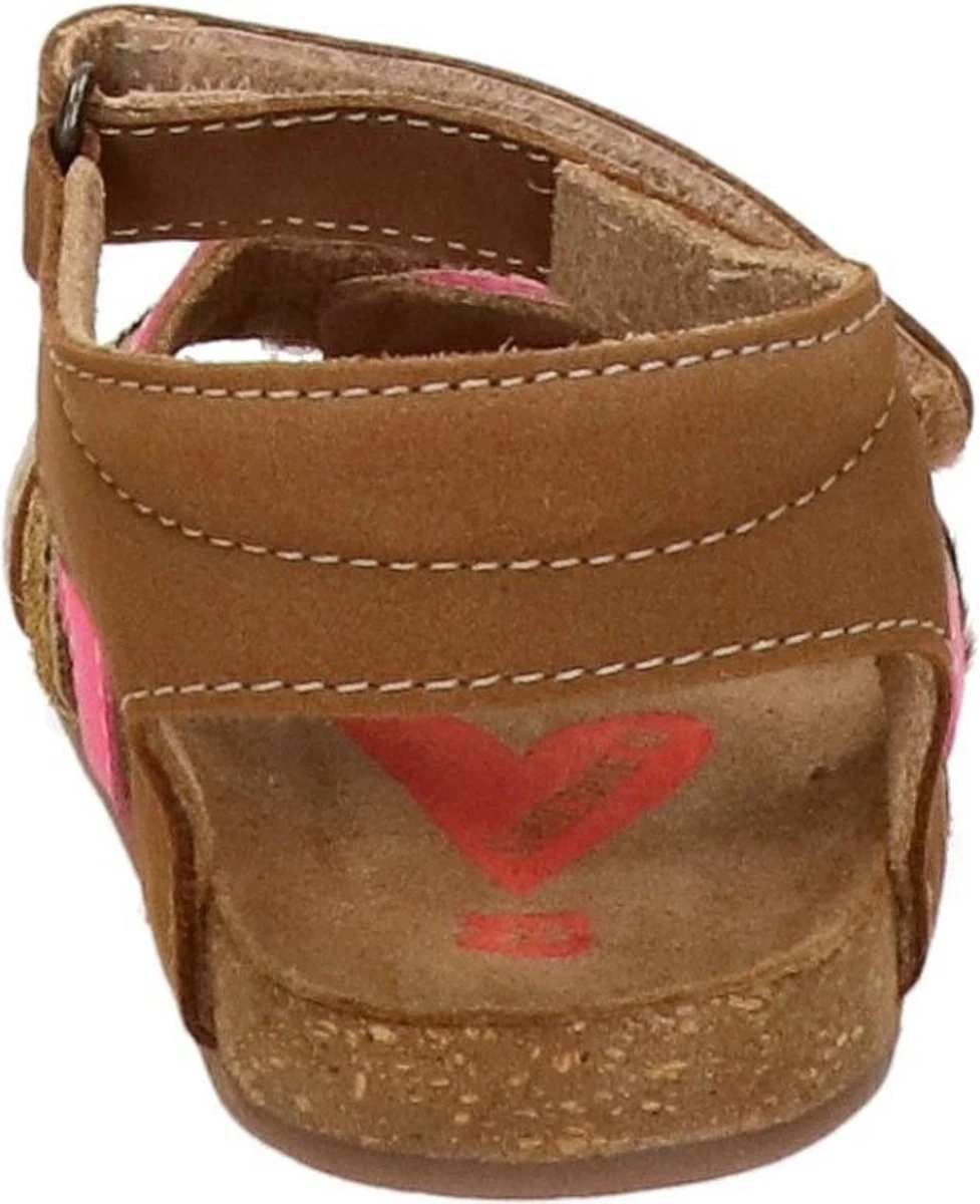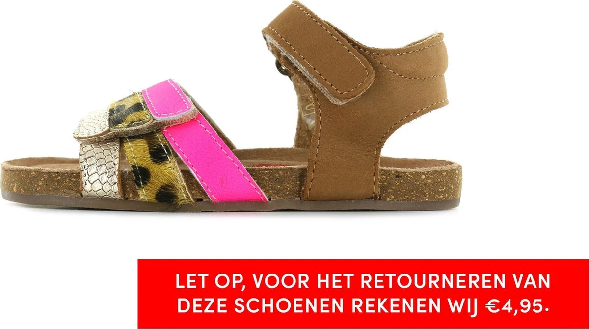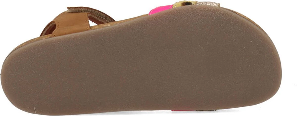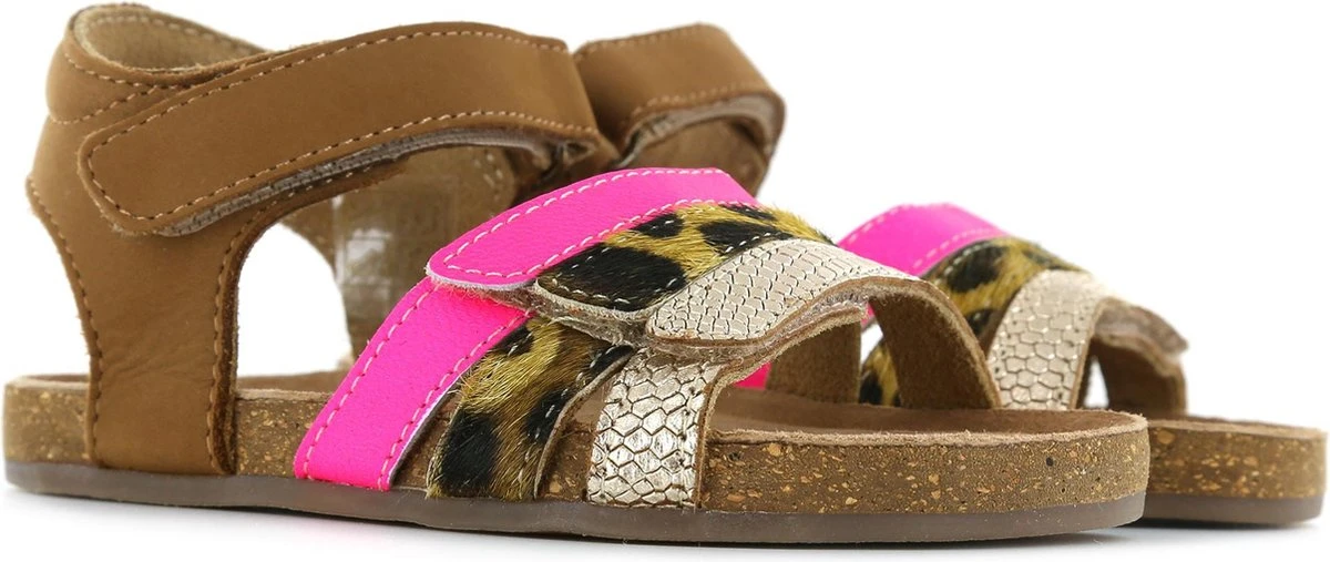 Super leuke sandaal voor de meiden. Gemaakt van cognac leer, met fuchsia en snake-bandjes op de voorvoet. De sandalen gaan gemakkelijk aan en uit door de twee klittenbandsluitingen. Het lichtgewicht voetbed is van kurk en daardoor kunnen kids er lekker op