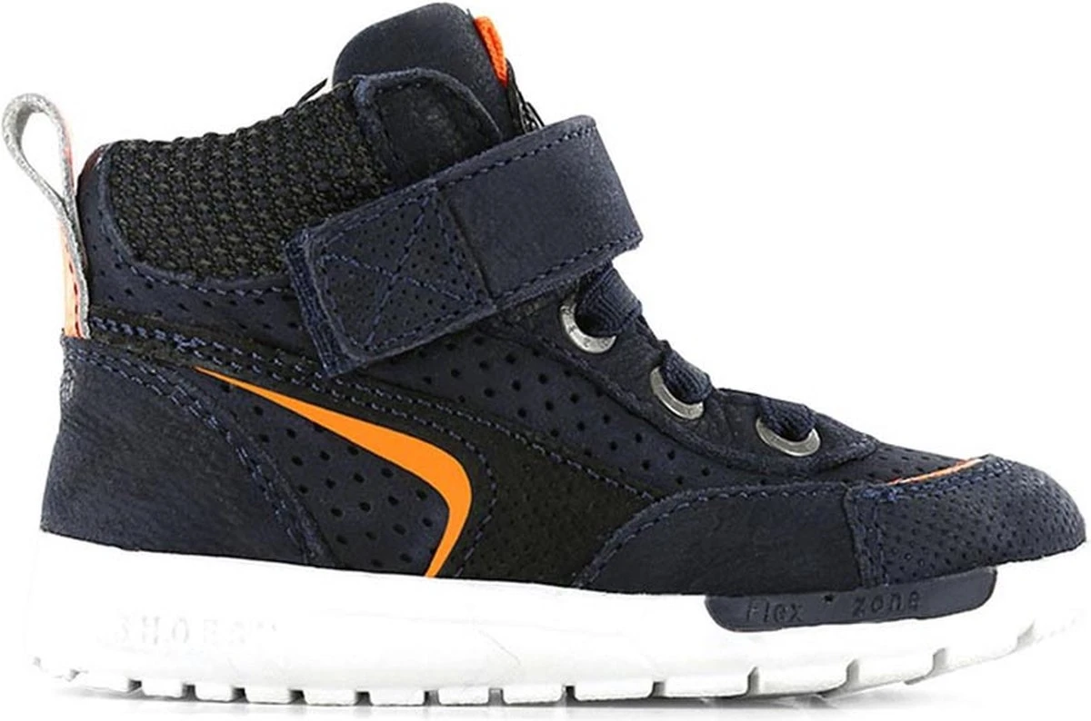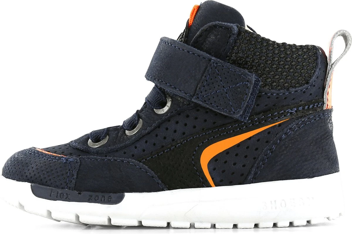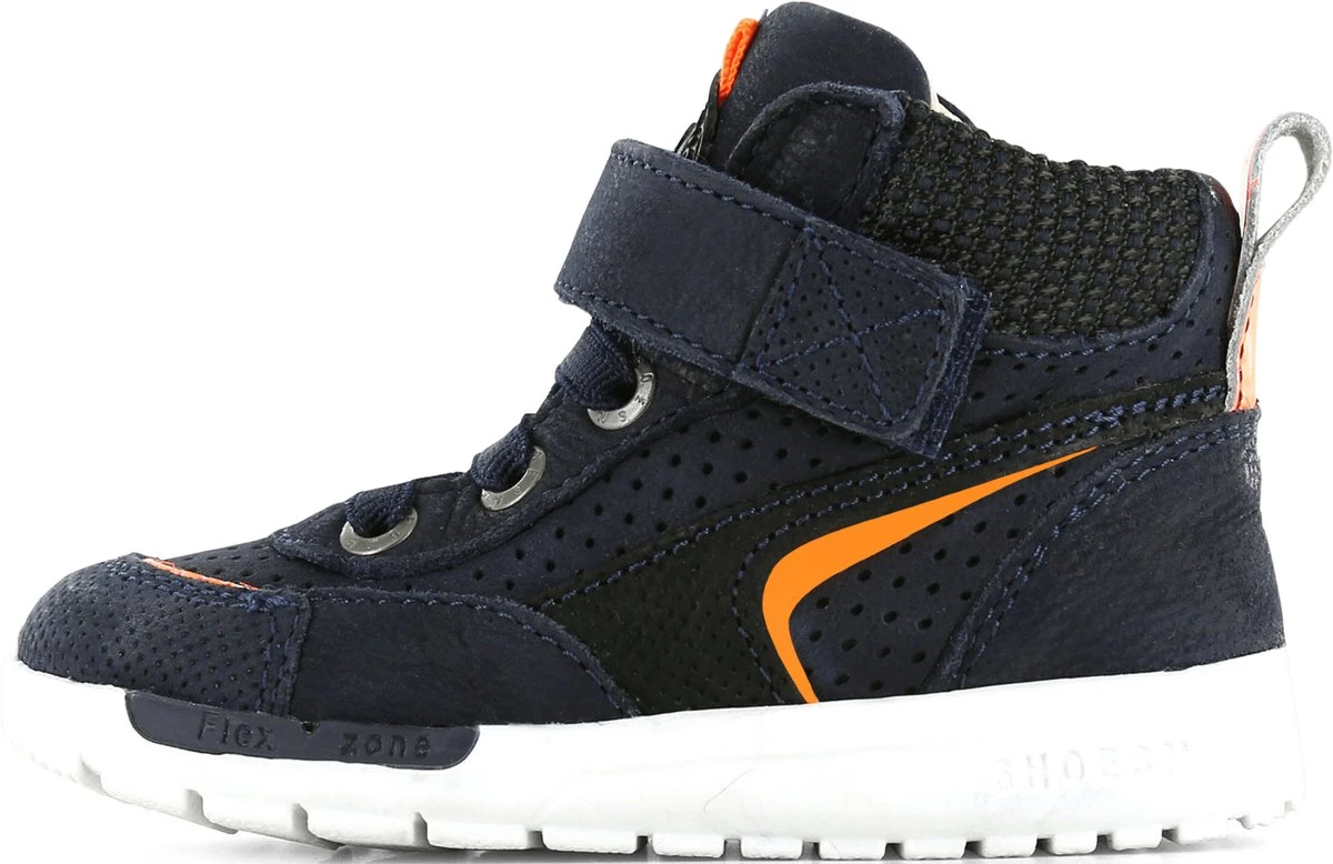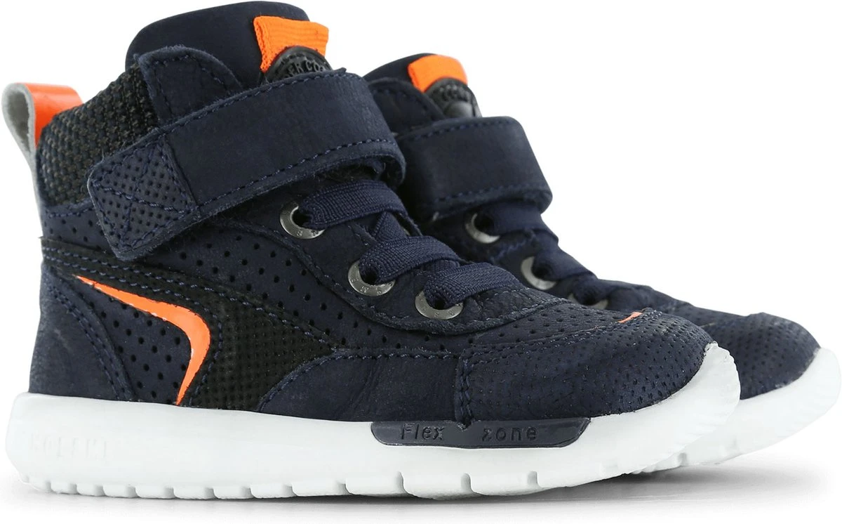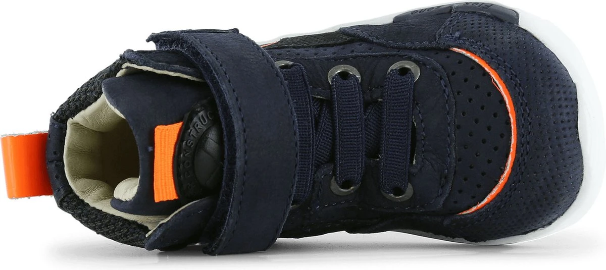Stoere hoge sneakers voor het najaar. Deze hoge sneakers zijn gemaakt van donkerblauw chroomvrij leer met een coole oranje striping op de zijkant. Verder heeft de schoen een coole bies van mesh bij de enkel en een contrasterende lus op de hiel. Schoenen uit de Runflex collectie zijn geschikt voor kids die inmiddels al goed los kunnen lopen. Deze sneakers zijn fijne schoenen om te kiezen als vervolgschoentje (na de eerste stapjes) maar zijn ook super geschikt voor kids die al rennend en springend rondhuppelen.De natuurrubberenzool is wat steviger dan die van de eerste stapschoentjes maar nog altijd erg flexibel. Hierdoor krijgt je kind de beste ondersteuning bij het lopen, spelen en rennen. De sneaker is volledig leer gevoerd en voorzien van een uitneembaar voetbed. De sneakers gaan gemakkelijk aan en uit met de elastieken veters en klittenbandsluiting. • 100% leer • Natuurlijk rubberen zool • Verstevigde hielen • Flexibele en dempende zool voor goede afwikkeling • Handgemaakt in Portugal