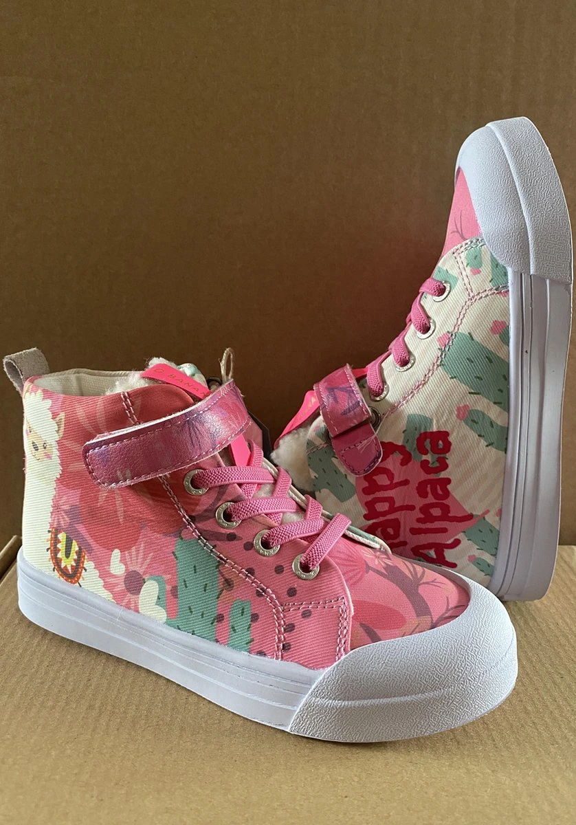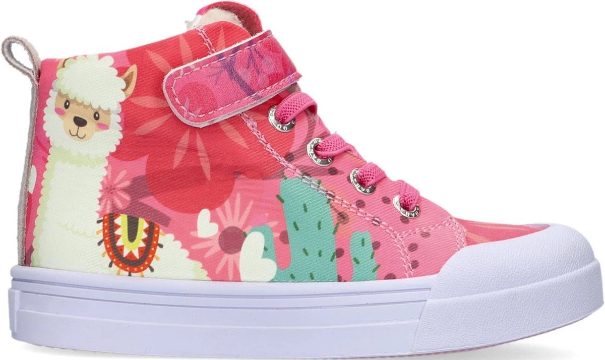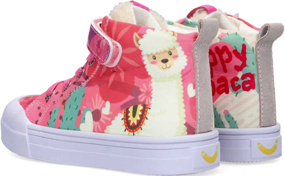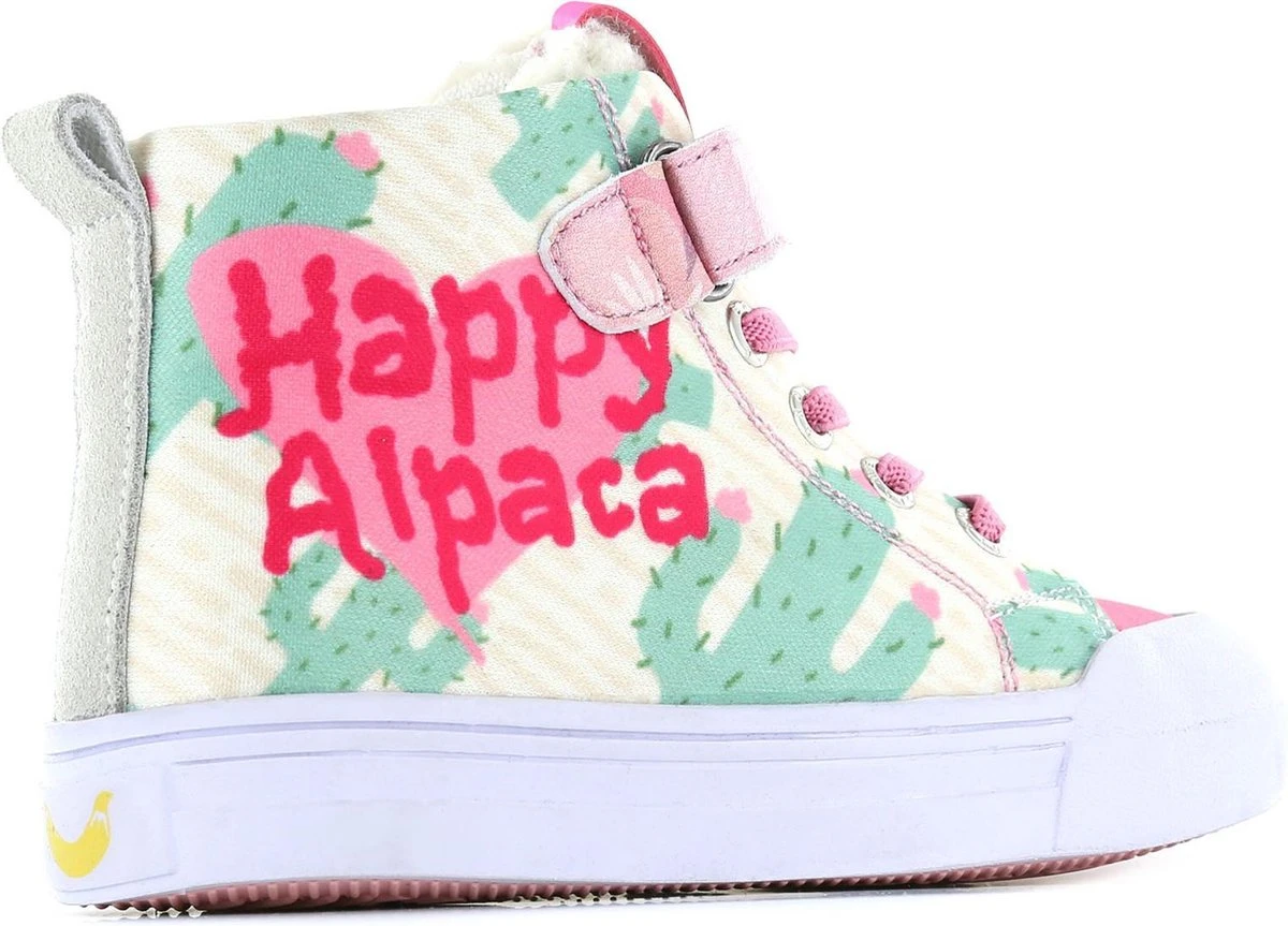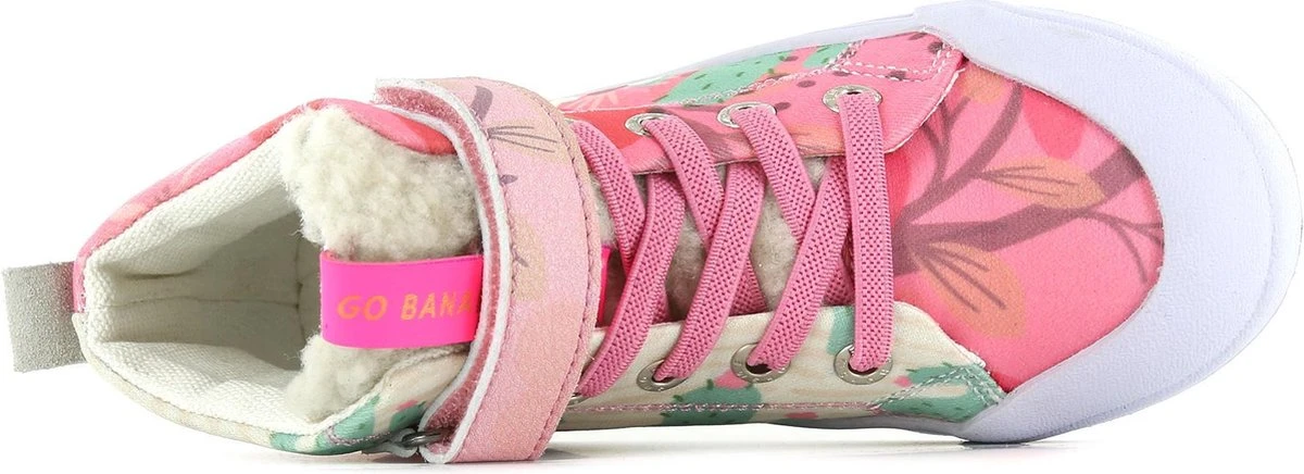 De Go Banana’s Alpaca sneaker. Deze leuke meiden sneakers hebben een roze bloemenprint, met cactussen en een happy Alpaca. De 100% natuurrubberen zool geeft bescherming aan de kindervoetjes. Deze sneaker is voorzien van een elastieken veter- en klittenbandsluiting, een antibacteriële zool én heeft een anatomisch gevormd voetbed voor een verhoogd loopcomfort. Het canvas is voorzien van een speciale waterproof laag, waardoor de schoen bestand is tegen spatwater. De voetjes blijven dus droog!• Voetbed (canvas) is uitneembaar en uitwasbaar • Zachte, gefoamde voering • Brede instap, passend voor iedere voet • Bevat een stootneus, minder kans op beschadiging