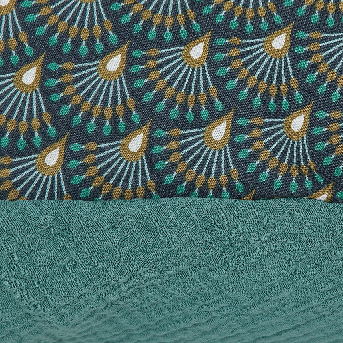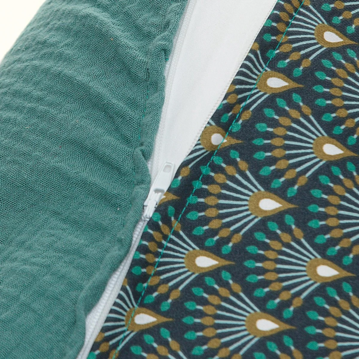 De Snoozzz voedingskussenhoes Ginza Groen is gemaakt van 100% katoen, Hydrofiel. Deze soepele stof is ventilerend en heeft een zachte en fijne structuur waardoor deze heel geschikt is voor een voedingskussen. De bovenzijde is heeft een modern design. De onderzijde heeft een mooie effen blauw groene kleur.