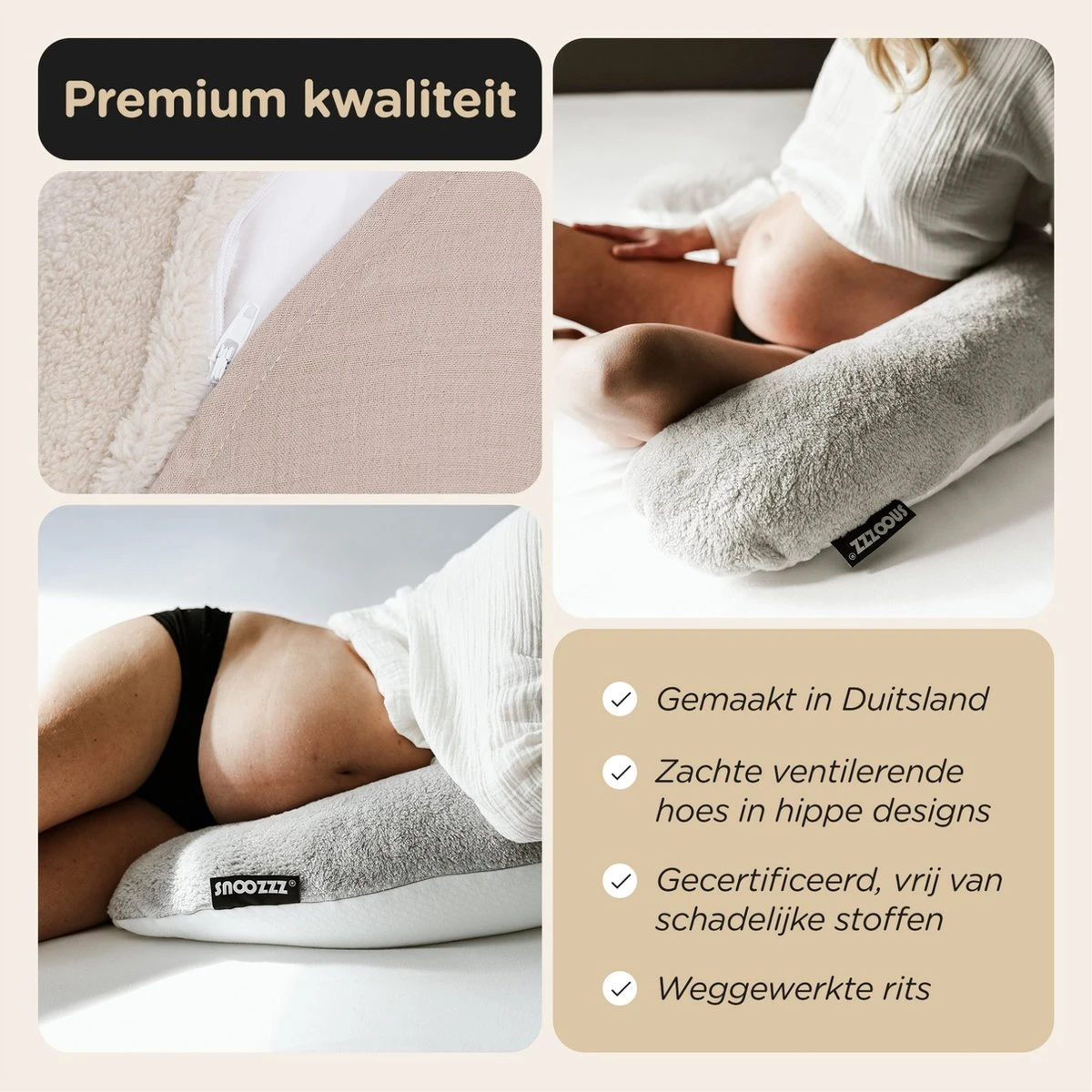 Het Snoozzz zwangerschapskussen is verkozen tot beste zwangerschapskussen. In het Snoozzz zwangerschapskussen zitten alle premium materialen en goede eigenschappen in één zwangerschapskussen. Het heeft een geruisloze vulling van microparels, is flexibel en licht in gewicht, ventileert goed en geeft de ondersteuning daar waar het nodig is.