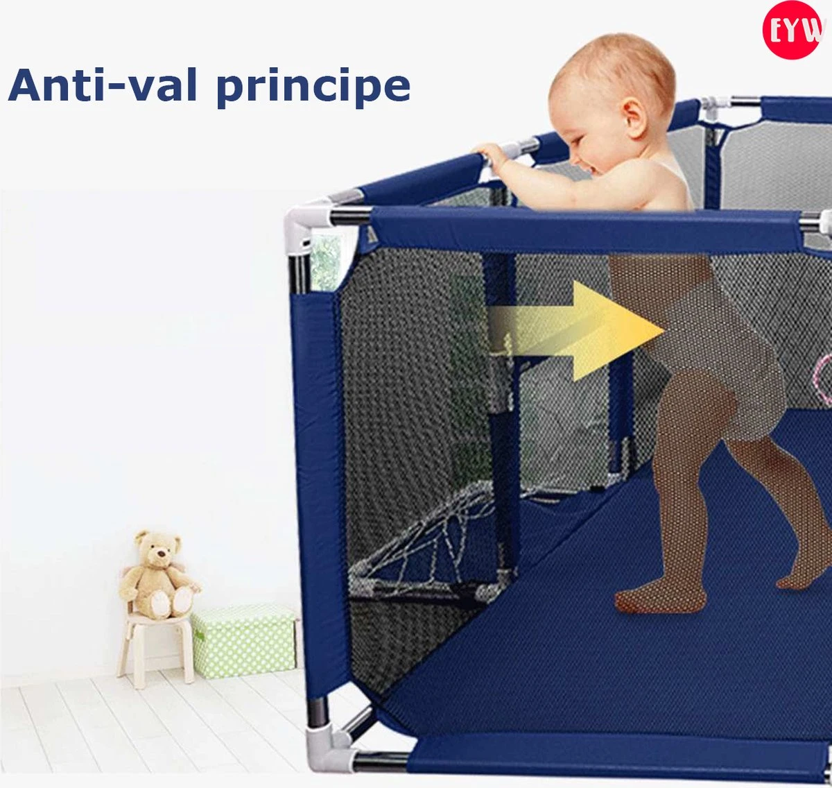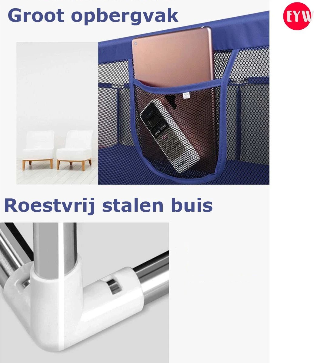 De extra grote Speelbox is perfect voor uw baby, peuter of kleuter om in te laten spelen. Omdat het een veilige en afgesloten ruimte biedt om in te spelen. Het metalen frame is eenvoudig te monteren en kan snel en gemakkelijk worden opgeborgen wanneer het niet in gebruik is. Het is gemakkelijk schoon te maken en is het materiaal duurzaam. Ook is er een opbergvakje bevestigd aan een van de zijdes waar u gemakkelijk uw spullen in op kunt bergen. De box is zo ontworpen dat uw kind veilig binnen de Playpen blijft en er niet overheen kan klimmen. Aan de onderkant bevinden zich de zuignappen, deze zorgen ervoor dat de Speelbox uit zichzelf niet verplaatst tijdens het spelen.