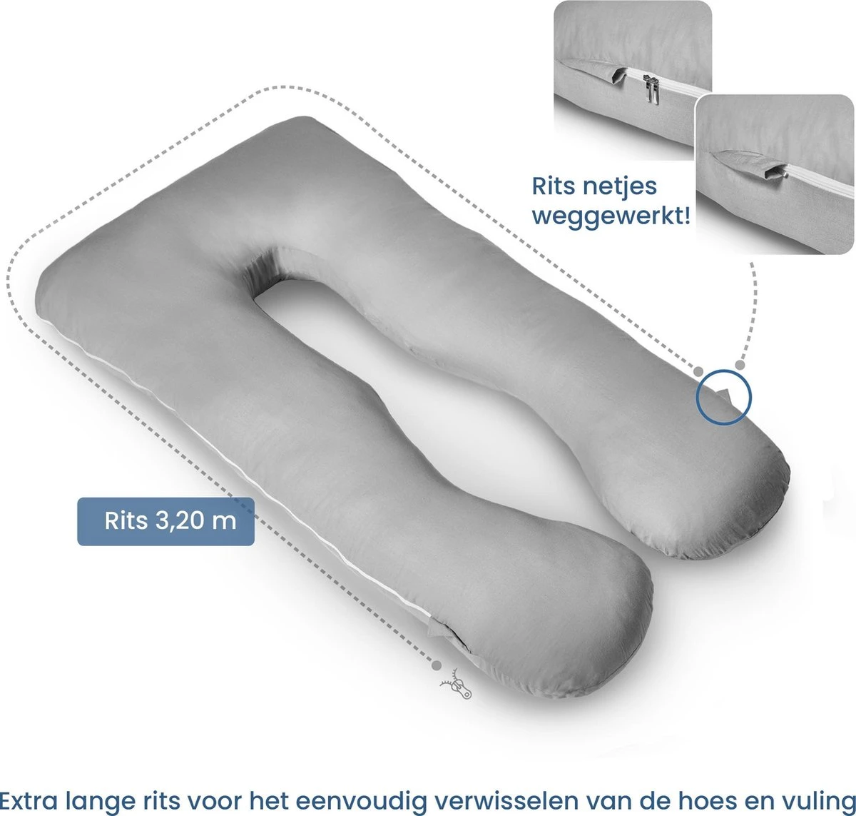 Het zwangerschapskussen heeft een afneembare en wasbare hoes een met gouden rits van 3.2 meter waardoor deze gemakkelijk te verwisselen is. Aan het uiteinde van de rits zit aan beide zijden een beschermhoesje zodat de rits netjes weggewerkt kan worden.