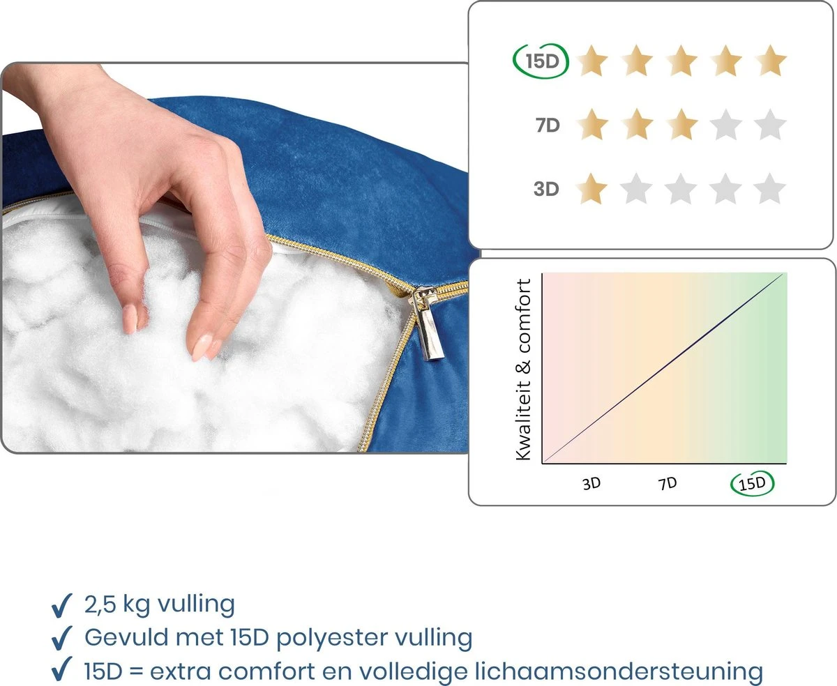Het kussen behoudt zijn vorm dankzij de duurzame D15-polyestervulling. Deze zorgt voor extra ondersteuning en past zich gemakkelijk aan, aan je lichaamsvorm. De 2,5 kg D15 vulling is tevens kenmerkend voor de Telano zwangerschapskussens. Doorgaans is 1900 gram D7 vulling de standaard voor zwangerschapskussens. Door de 2,5 kg D15 vulling zal je merken dat het Telano kussen extra luxe, stevig en comfortabel aanvoelt.