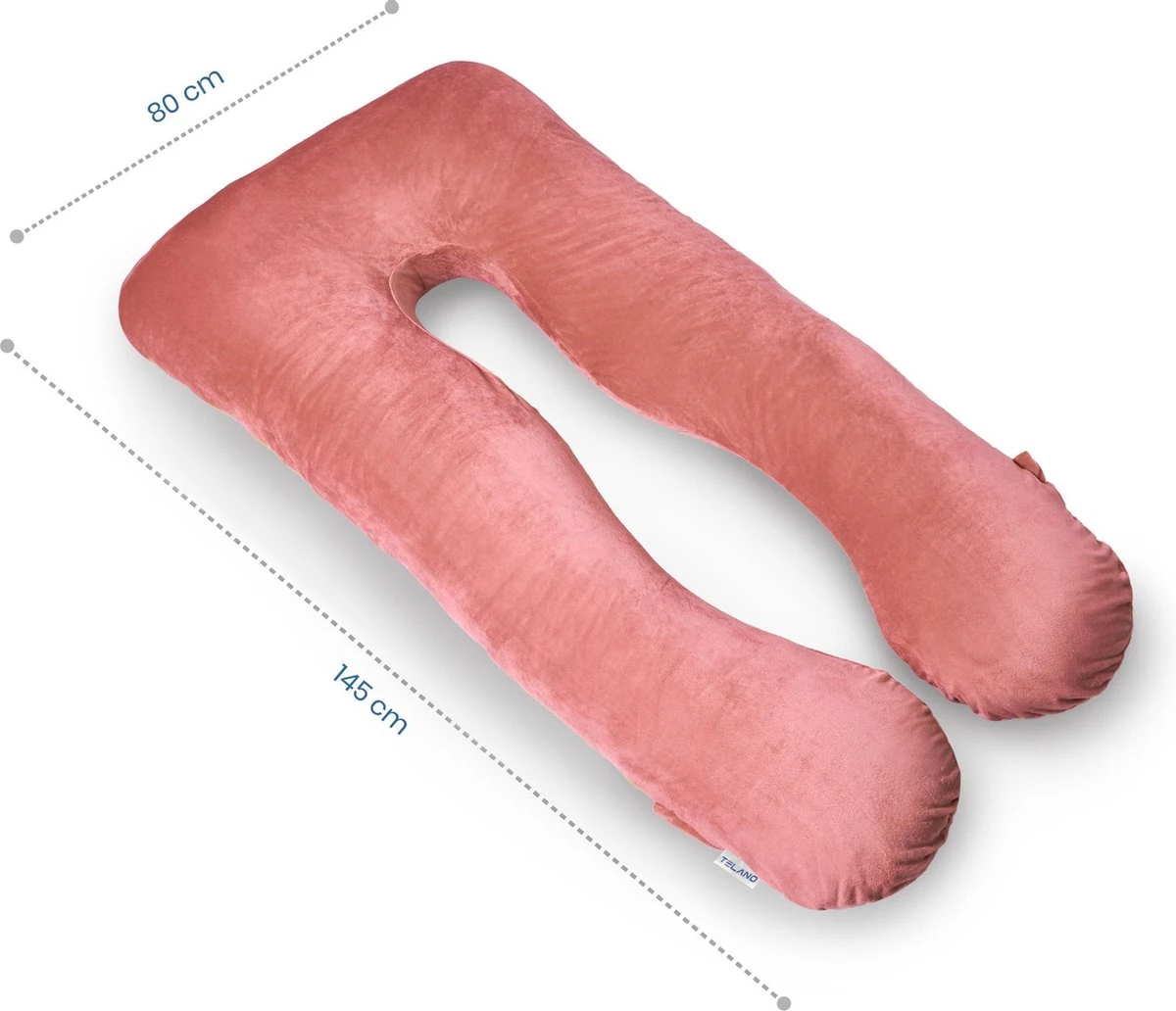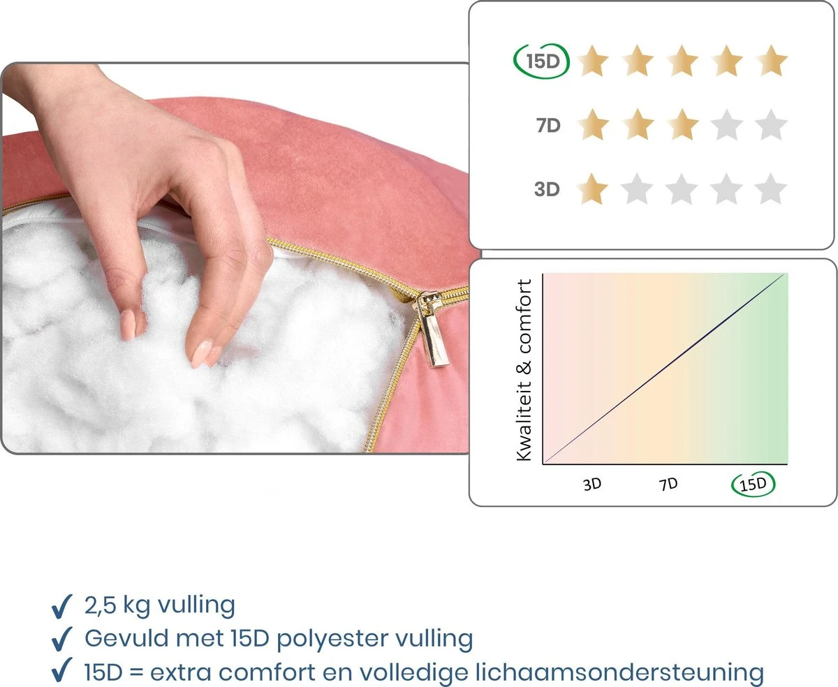 Het kussen behoudt zijn vorm dankzij de duurzame D15-polyestervulling. Deze zorgt voor extra ondersteuning en past zich gemakkelijk aan, aan je lichaamsvorm. De 2,5 kg D15 vulling is tevens kenmerkend voor de Telano zwangerschapskussens. Doorgaans is 1900 gram D7 vulling de standaard voor zwangerschapskussens. Door de 2,5 kg D15 vulling zal je merken dat het Telano kussen extra luxe, stevig en comfortabel aanvoelt.