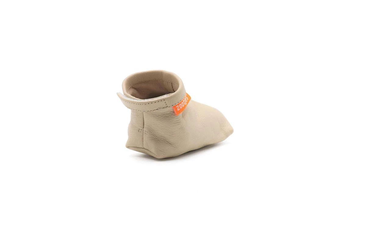 Babyslofjes Zootje / My first shoes – Warm beigeDeze unisex beige babyslofjes van Zootjes / My First shoes zijn gemaakt van een A-kwaliteit bio leer. Hierdoor zijn ze heerlijk zacht en warm. Echte slofjes van bio leer zijn super soepel en comfortabel. Dit geeft het een gevoel van lopen op blote voetjes. En dat had je vast al door: baby’s vinden het heerlijk om op blote voetjes te kruipen en lopen. Met deze slofjes heeft je kleintje dus wel het gevoel van blote voetjes, maar de bescherming en steun van slofjes. En de Zootje slofjes bieden gelijk extra grip op gladde vloeren middels het leer van de slof. Dit is wel zo fijn bij de eerste stapjes en het kruipen. Zootje slofjes met klittenband achter de hielDeze slofjes hebben een velco strip op de hiel waardoor de Zootjes passend kunnen worden gesloten zodat de slofjes goed aanblijven en niet uit glijden.